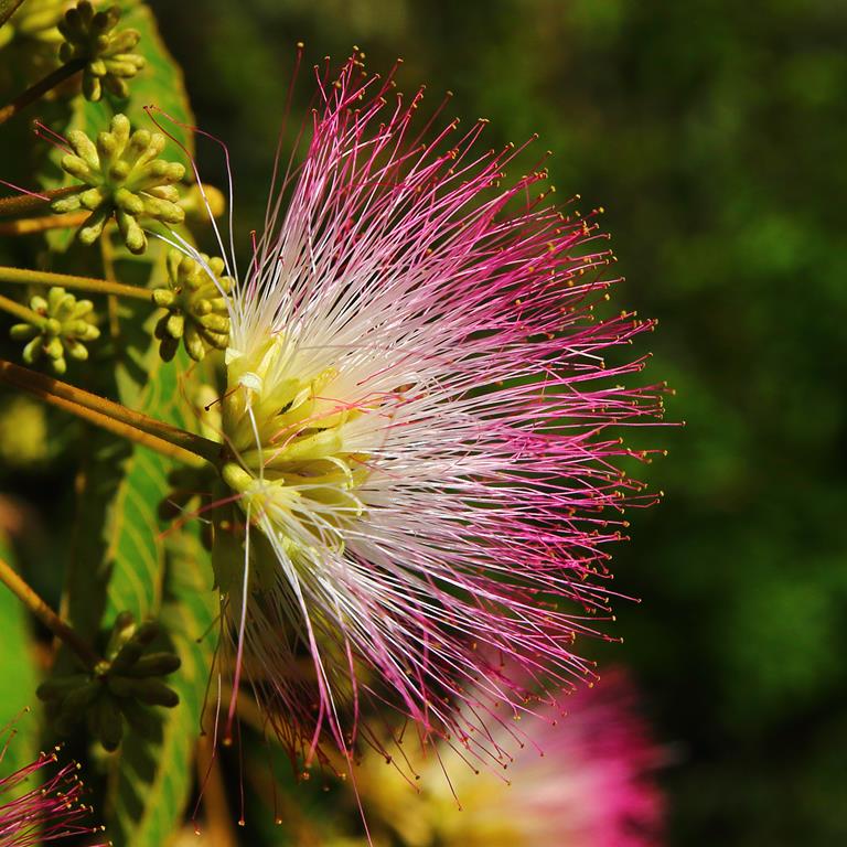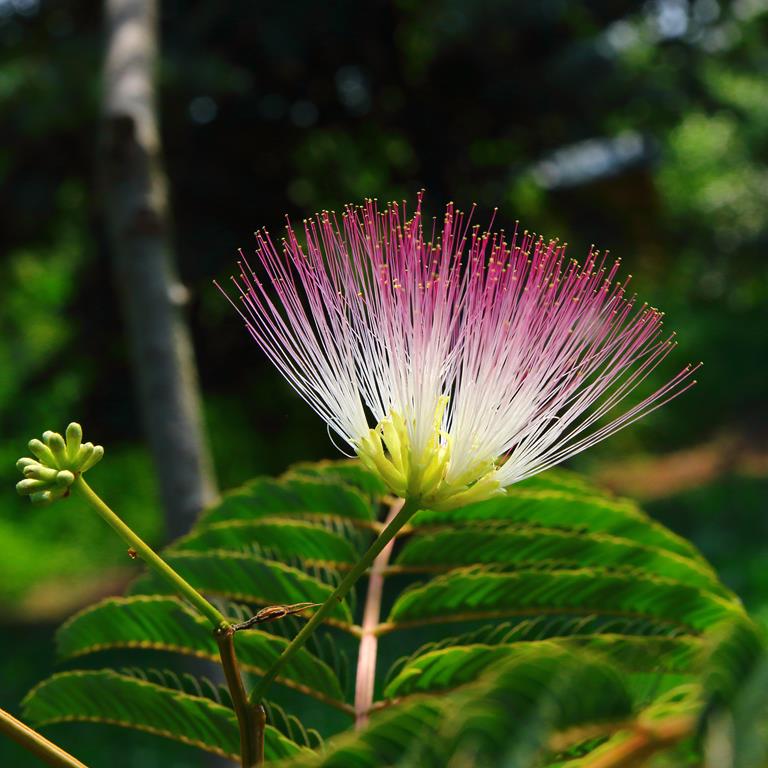 Opis. Krótkowieczne drzewo o rozłożystym, parasolowatym pokroju. W naturze dorasta do 12 m wysokości. Liście pierzastozłożone, duże, do 45 cm długości. Kwiaty różowe, bezpłatkowe, z długimi różowymi pręcikami, zebrane w główkowate kwiatostany na szczytach pędów. Kwitnie od lipca do początku września.