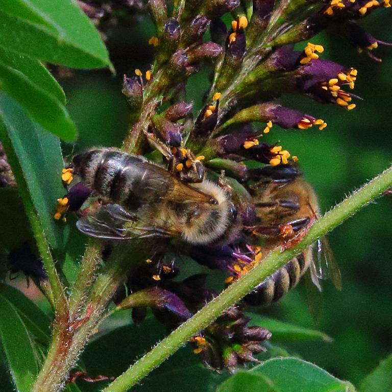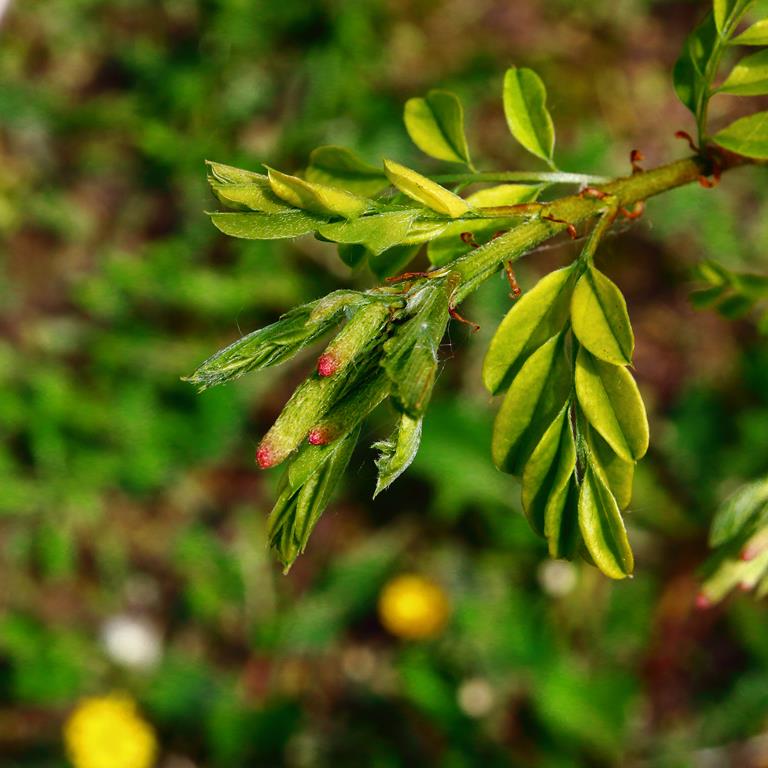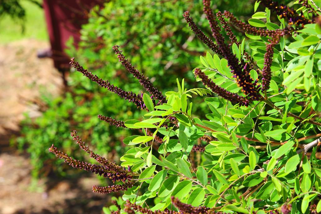 Opis. Słabo rozgałęziony, rozłożysty krzew wysokości do 5-6 m. Liście pierzaste, złożone z małych szeroko lancetowatych, zielonych listków. Kwiaty drobne, fioletowe, zabrane w kłosowate kwiatostany na szczytach pędów. Kwitnienie od pierwszej lub drugiej dekady czerwca przez około 3 tygodnie.