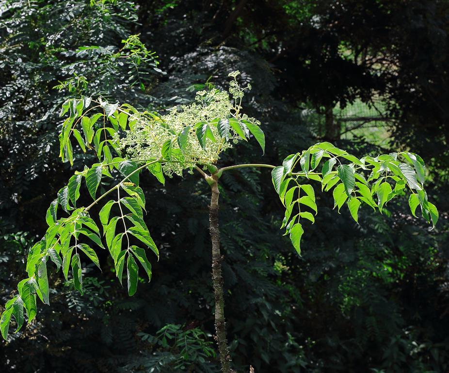 Opis. Niewielkie drzewo lub wysoki krzew o parasolowatej koronie, dorastający do 8 m wysokości. Pędy grube, wzniesione, pokryte krótkimi kolcami. Liście pierzaste, okazałe, do 100 cm dł. Kwiaty białe, niepozorne zebrane w szerokie baldachogrona. Kwitnie pod koniec lata. Owoce niewielkie, czarne. Wytwarza odrosty korzeniowe. Posiada właściwości lecznicze o działaniu podobnym do żeń-szenia.