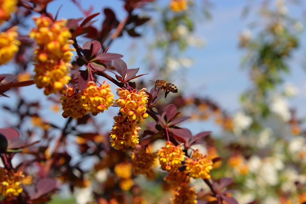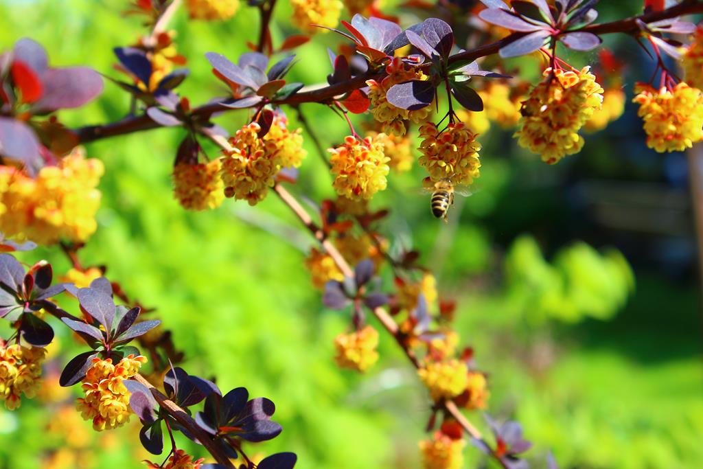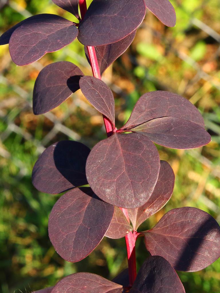Opis. Wysoki, ciernisty krzew osiągający 2-4 m wys. Liście owalne, czerwonopurpurowe, matowe z wierzchu. Kwiaty niewielkie, żółte, zebrane w zwisające grona. Kwitnie obficie w połowie maja.