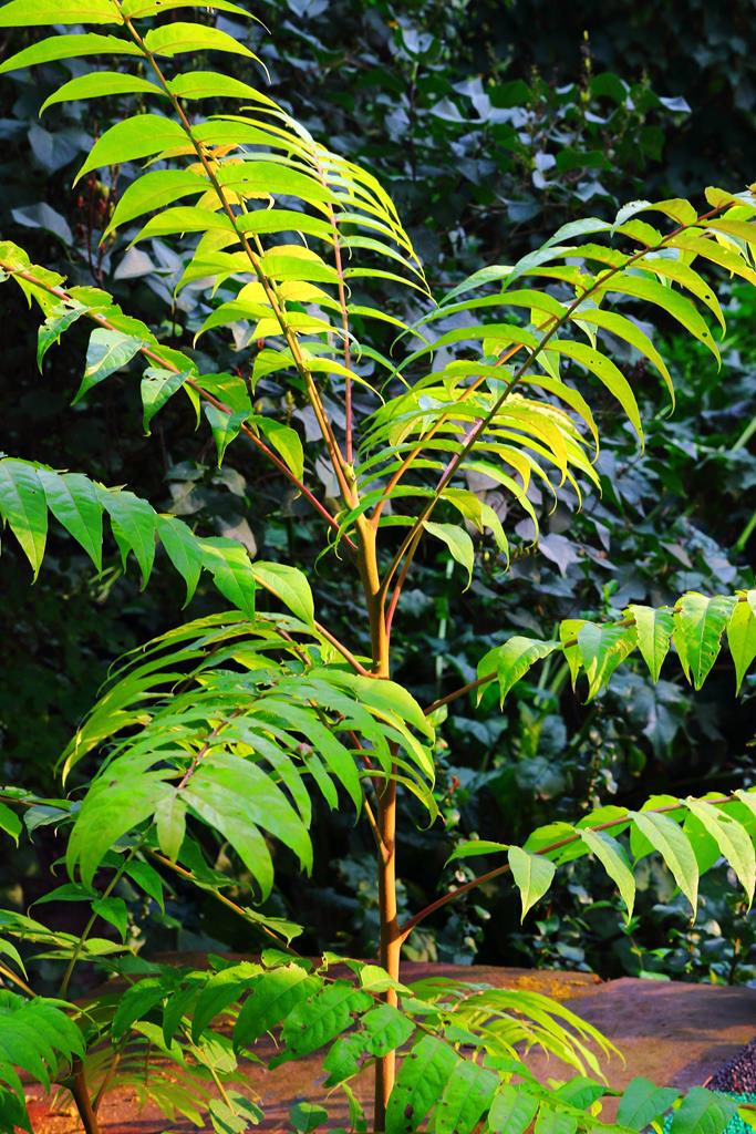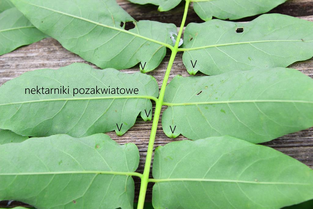 Opis. Szybko rosnące drzewo do 25 m wysokości. Liście pierzasto złożone, bardzo duże, do 1 m długości, z nektarnikami pozakwiatowymi (u nas nieczynne). Kwiaty drobne, zielonkawe, zebrane w gęste wiechy, rozwijające się w czerwcu. Owoce dekoracyjne, liczne jasnozielone skrzydlaki. Wytwarza odrosty korzeniowe. Roślina dwupienna.