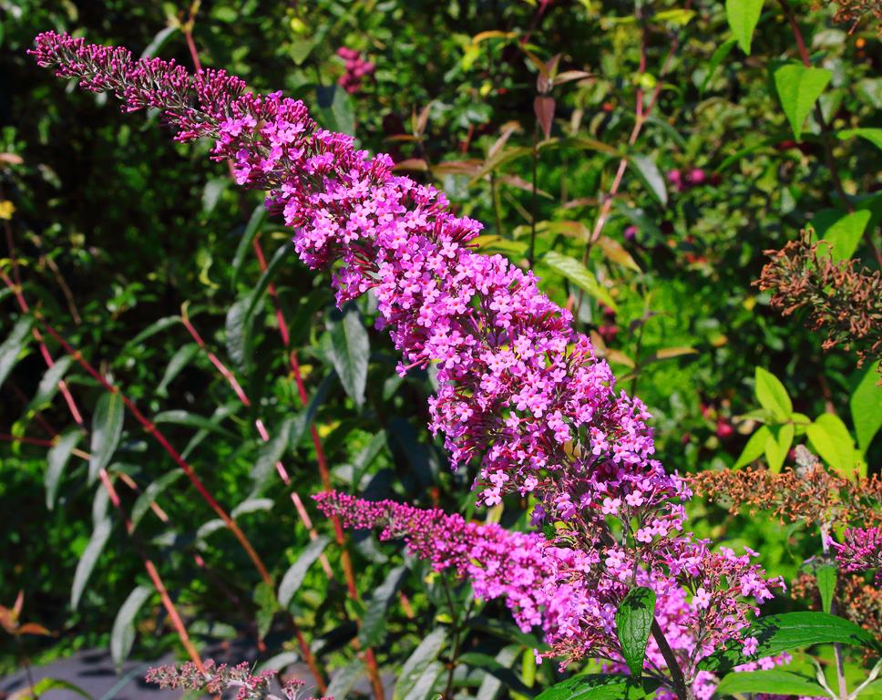 Opis. Krzew 2-3 m wysokości. Pędy wzniesione, w górze łukowato wygięte. Liście lancetowate, ciemnozielone. Kwiaty purpurowe, pachnące, zebrane w wiechy długości do 50 cm. Kwitnie obficie na tegorocznych pędach w lipcu-sierpniu.