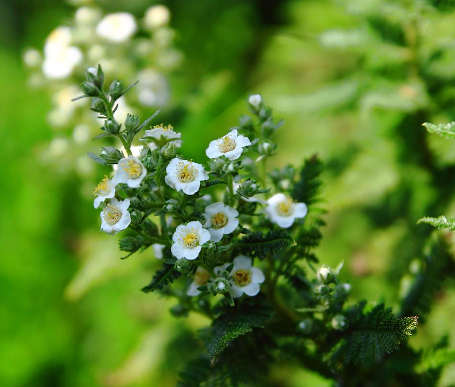 Opis. Aromatyczny krzew dorastający do 2 m wysokości. Liście szarozielone, podwójnie pierzasto złożone. Kwiaty białe, pięciopłatkowe, drobne, zebrane na szczytach pędów. Kwitnie w lipcu.