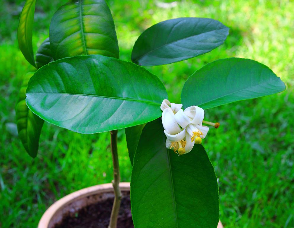 Opis. Karłowe, zimozielone drzewko dorastające w uprawie pojemnikowej do ok. 2-3 m wysokości. Korona zwarta, gęsta. Liście ciemnozielone, duże, eliptyczne. Kwiaty białe, średnicy około 2-3 cm, mocno pachnące. Kwitnie przez cały rok. Owoce jadalne, duże, do 1 kg. Odmiana samopylna.
