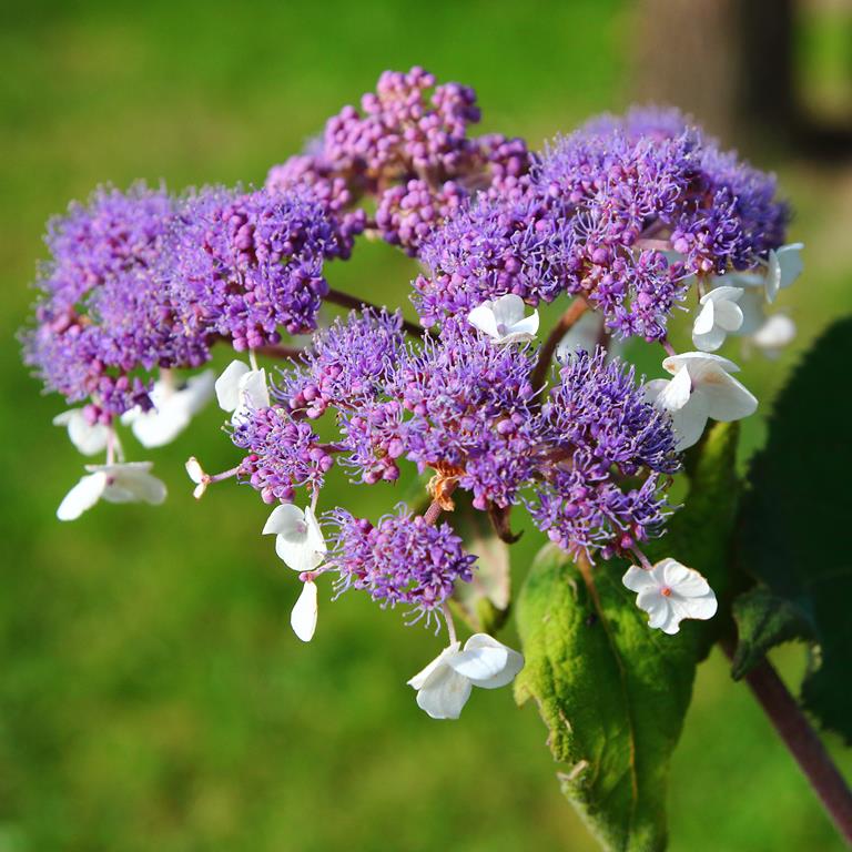 Opis: Krzew dorastający 2-3 m wysokości. Pędy grube, sztywne, słabo rozgałęzione. Liście ciemnozielone, eliptyczne, do 30 cm długości, pokryte charakterystycznymi włoskami. Kwiaty płodne drobne, jasnofioletowe zebrane w płaskie kwiatostany otoczone białymi kwiatami płonnymi. Kwitnie w lipcu i sierpniu.