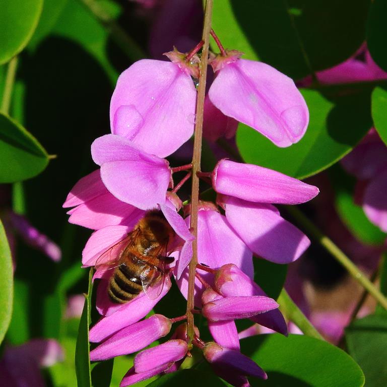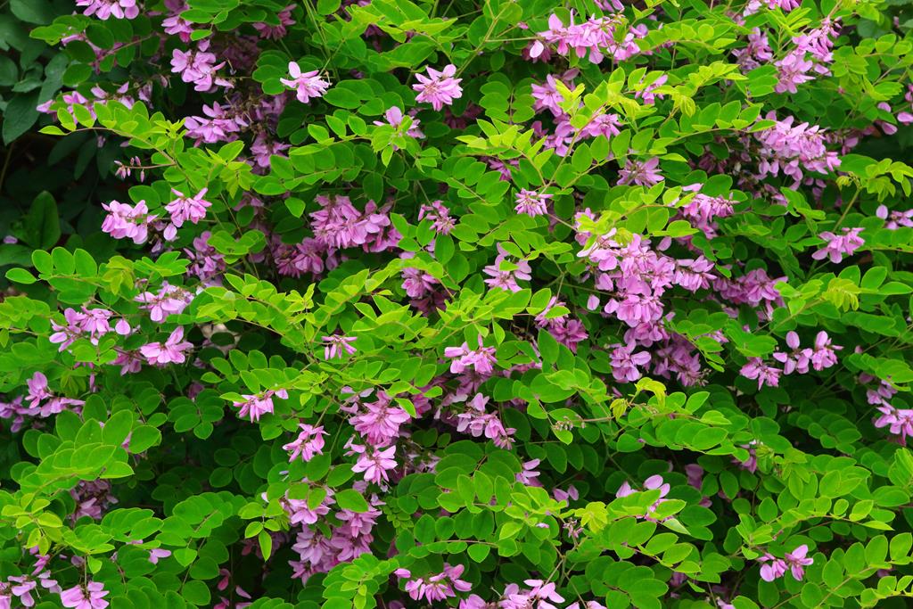 Opis. Gęsty krzew o półzdrewniałych pędach, dorastający do około 1 m wysokości i szerokości. Liście jasnozielone, pierzastozłożone. Kwiaty lilioworóżowe, motylkowate, zebrane w niewielkie grona. Kwitnie na tegorocznych pędach na przełomie czerwca i lipca. Okazjonalnie może powtarzać kwitnienie do jesieni.