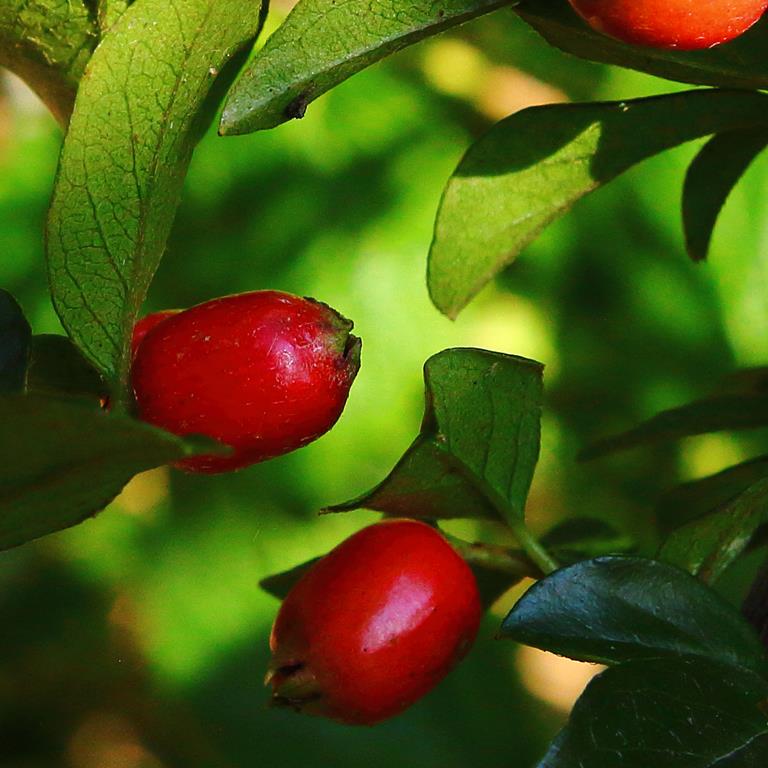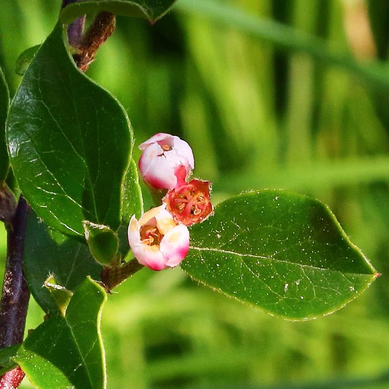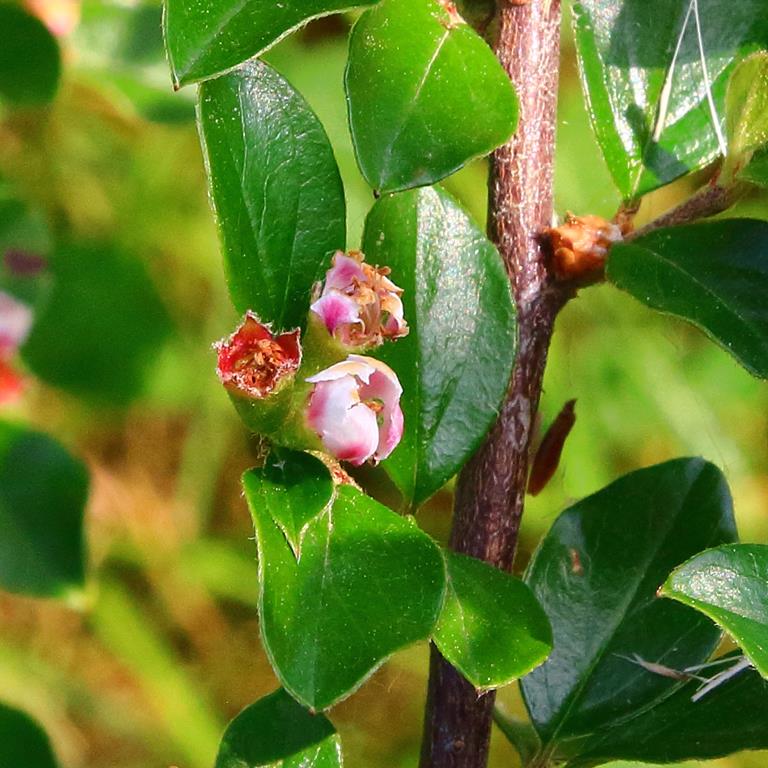 Opis. Gęsty, silnie rozrośnięty krzew do 2 m wysokości. Liście eliptyczne, ciemnozielone, błyszczące, jesienią przebarwiające się na szkarłatnoczerwony kolor. Kwiaty białe, drobne, czerwonawo zabarwione u nasady. Kwitnie na przełomie maja i czerwca. Owoce czerwone, wydłużone, do 1 cm długości.