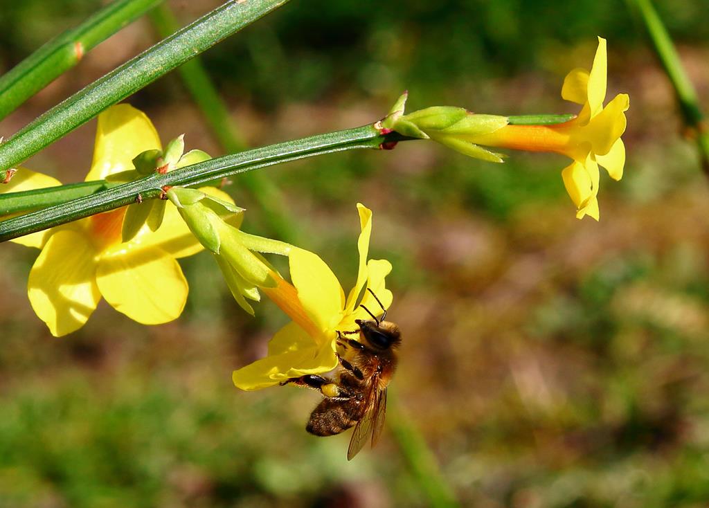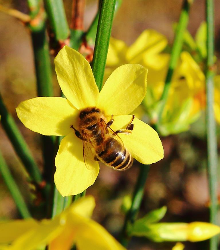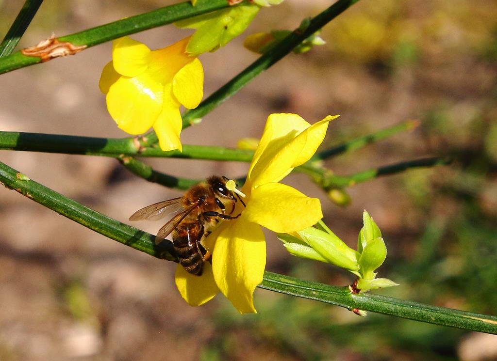 Opis. Krzew o rozłożystych, łukowato wygiętych pędach, osiągający do 2-3 m wysokości. Kwiaty jaskrawo żółte do 2 cm średnicy. Kwitnie przed rozwojem liści, od stycznia do połowy kwietnia.