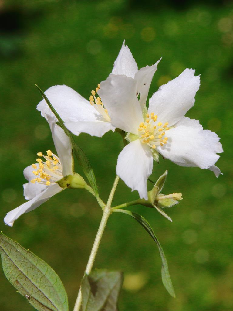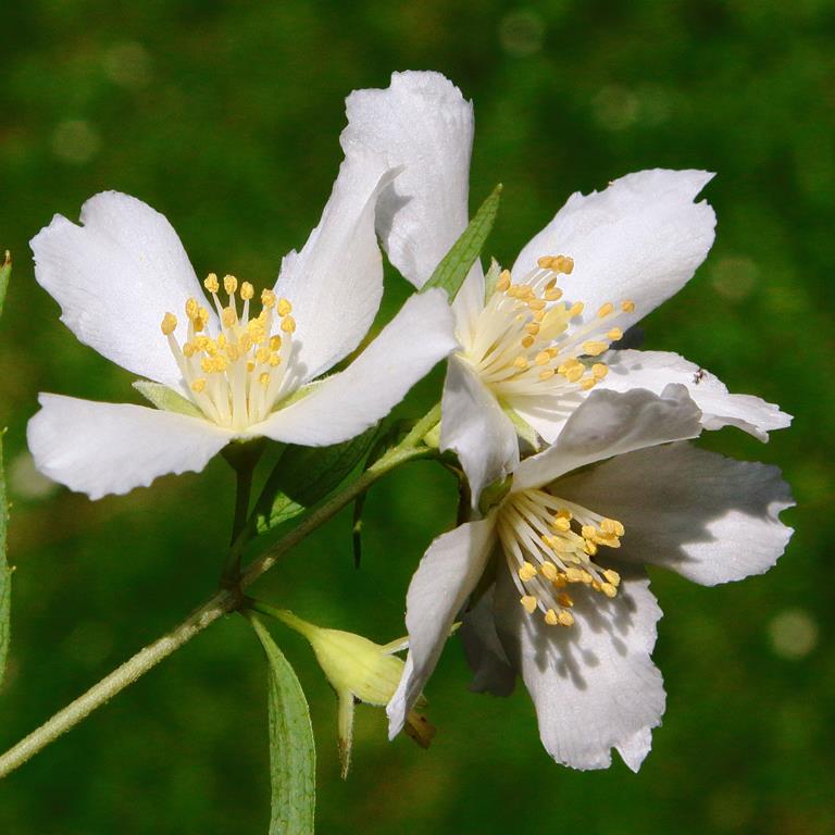 Opis. Zwarty, niewielki krzew osiągający 2 m wysokości i 1,5 m szerokości. Liście ciemnozielone, szorstkie. Kwiaty białe, pojedyncze lub półpełne, intensywnie pachnące. Kwitnie na przełomie czerwca i lipca.