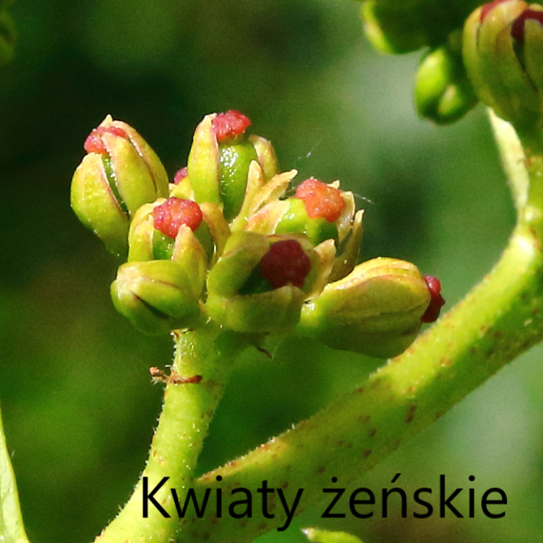 Opis. Drzewo wysokości 10-15 m, o szerokiej, gęstej koronie. Kora głęboko spękana z grubą warstwą elastycznego korka. Liście złożone, lancetowate lub jajowate. Kwiaty żółtozielone, drobne, zebrane w wiechy na szczytach pędów. Kwitnie bardzo obficie na przełomie maja i czerwca przez około 3 tygodnie. Gatunek dwupienny - kwiaty żeńskie i męskie na osobnych roślinach. Kwiaty męskie wydzielają ok. 30 % więcej nektaru w porównaniu z kwiatami żeńskimi. Owoce kuliste, początkowo zielone, po dojrzeniu czarne. Owocuje obficie zwykle co 2 lata.