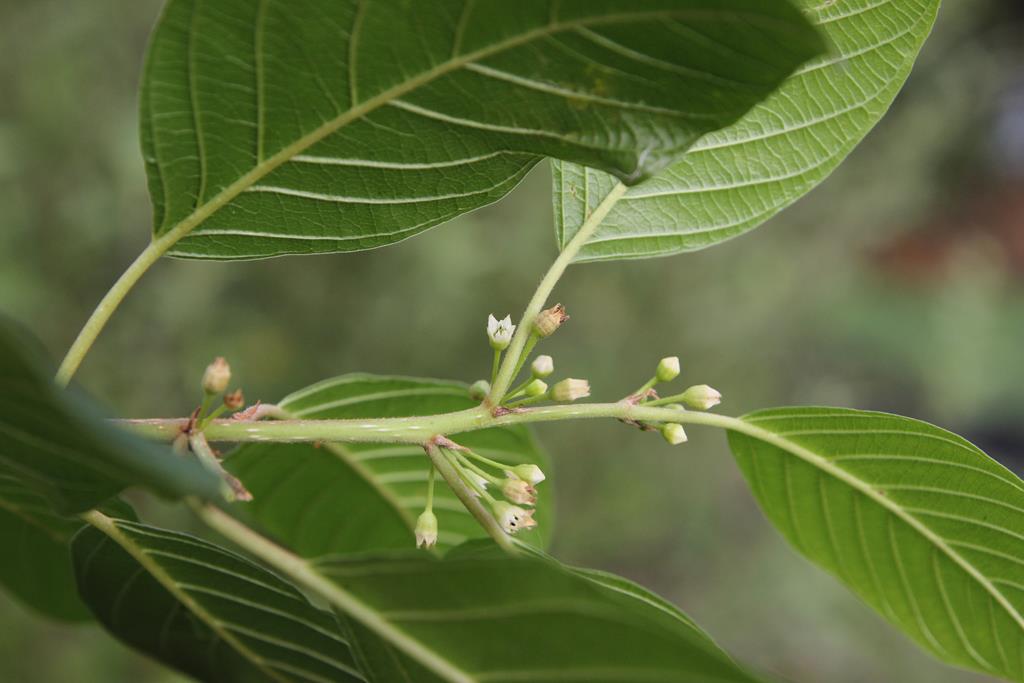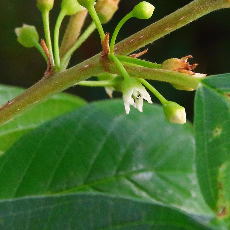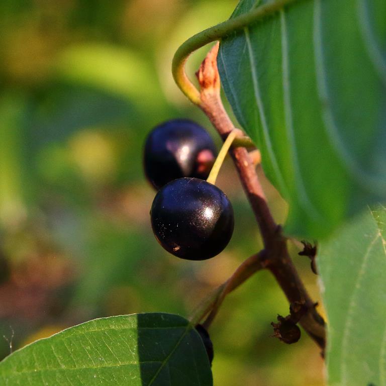 Opis. Krzew dorastający do 6 m wysokości. Pokrój luźny, gałęzie cienkie, bardzo kruche. Kora szarobrązowa, pokryta białymi przetchlinkami. Liście szeroko eliptyczne, do 7 cm długości. Kwiaty drobne, zielonobiałe, zebrane po 2-10 sztuk. Kwitnie od maja do drugiej połowy sierpnia. Owoce okrągłe, czarne, o średnicy do 8 mm, trujące. Roślina lecznicza.