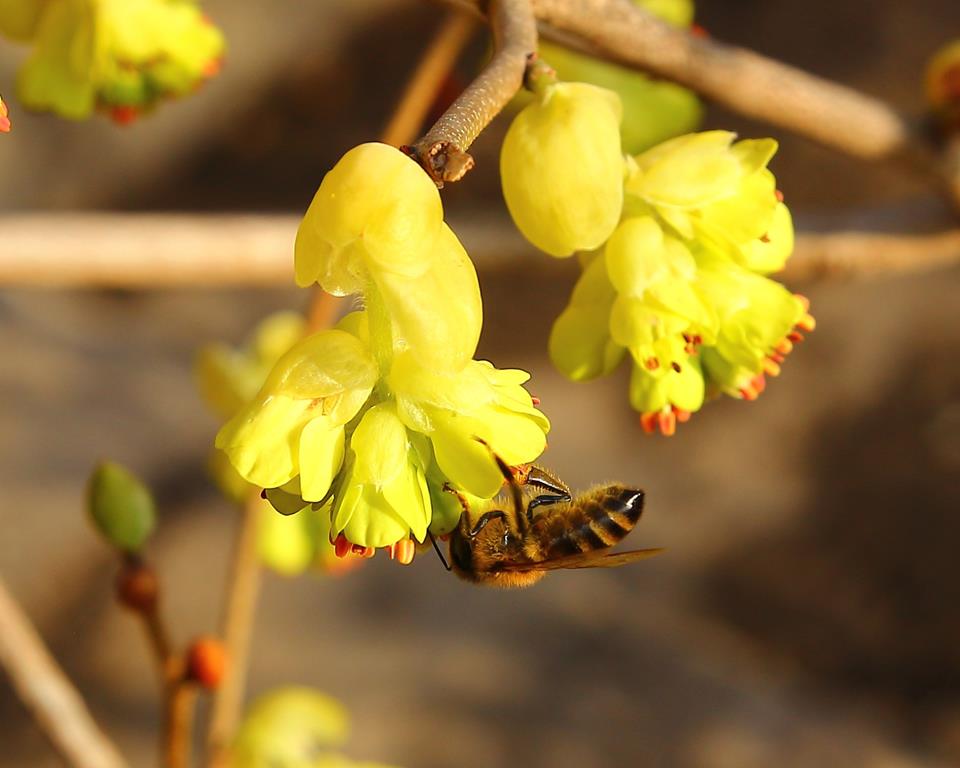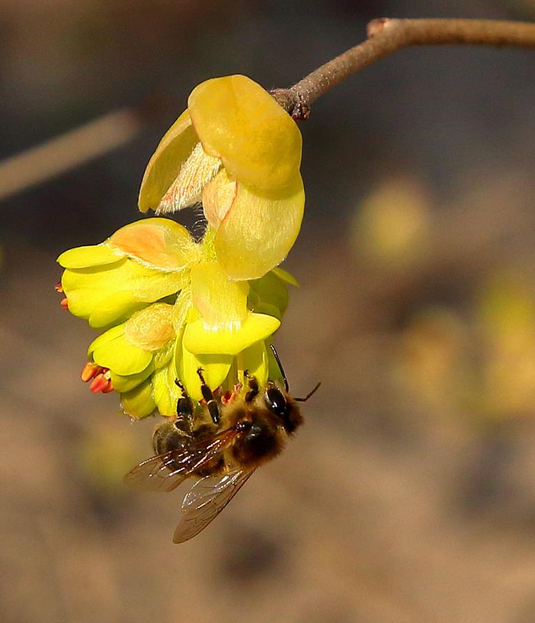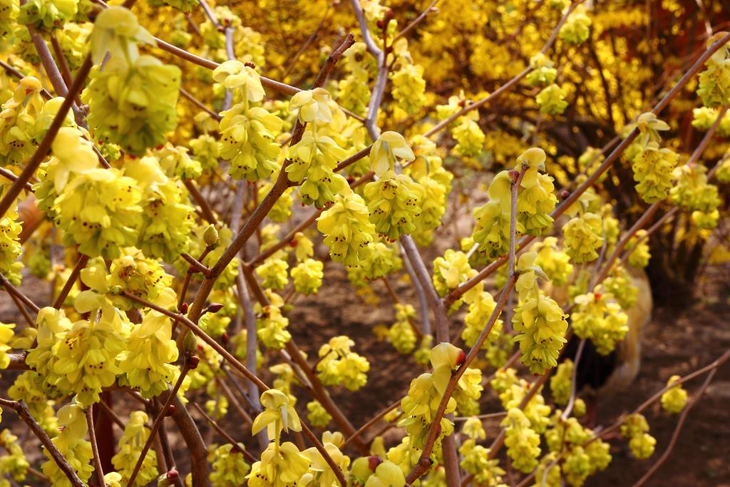 Opis. Krzew dorastający do wysokości 2-3 m. Pokrój nieregularny, szeroki. Liście jajowate, do 10 cm dł, Kwiaty żółte, dzwonkowate, zebrane w niewielkie zwisające kwiatostany. Zakwita pod koniec marca lub na początku kwietnia.