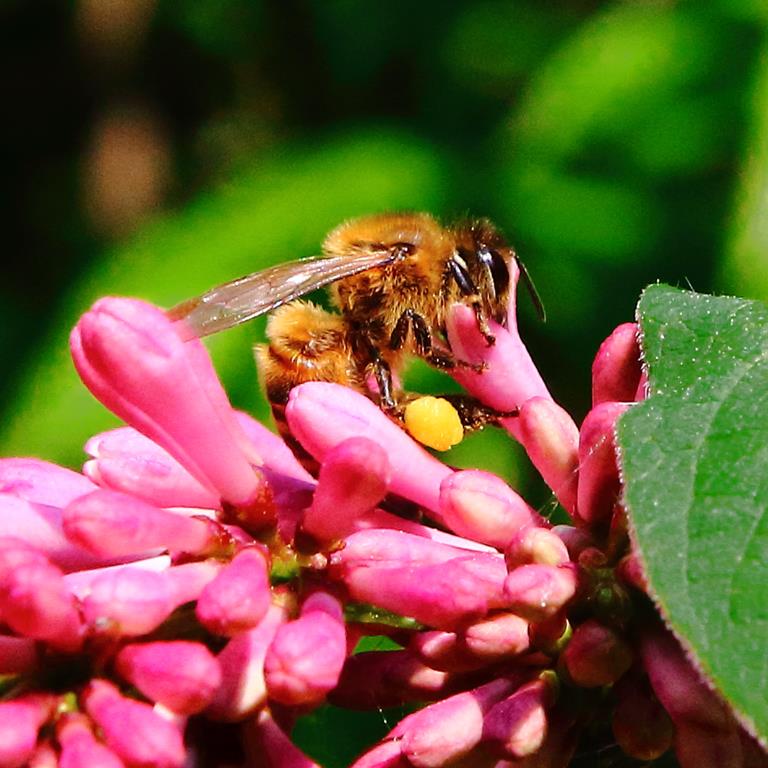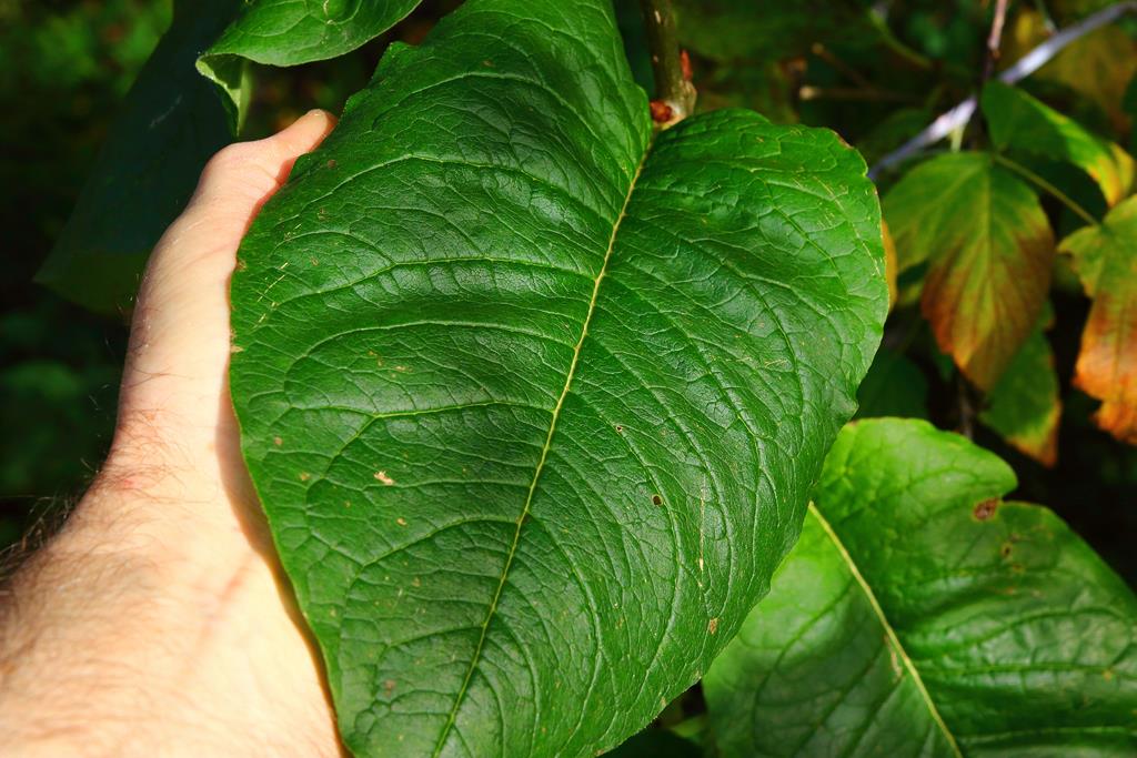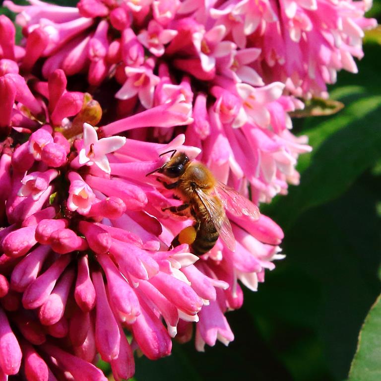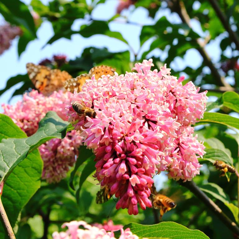 Opis. Krzew dorastający do 4 m wysokości. Pędy sztywne, wyprostowane. Liście ciemnozielone, eliptyczne, do 15-20 cm długości. Kwiaty czerwonoróżowe, zebrane w wąskie, lekko przewisające wiechy. Kwitnie w drugiej połowie maja.