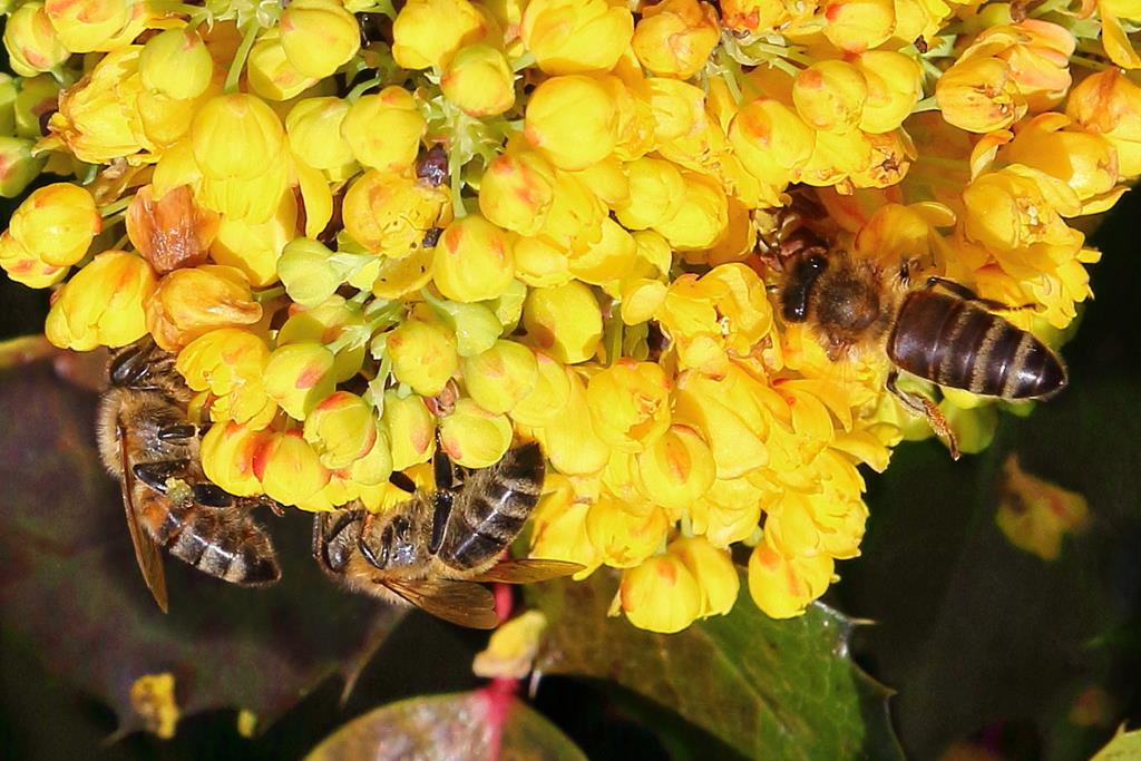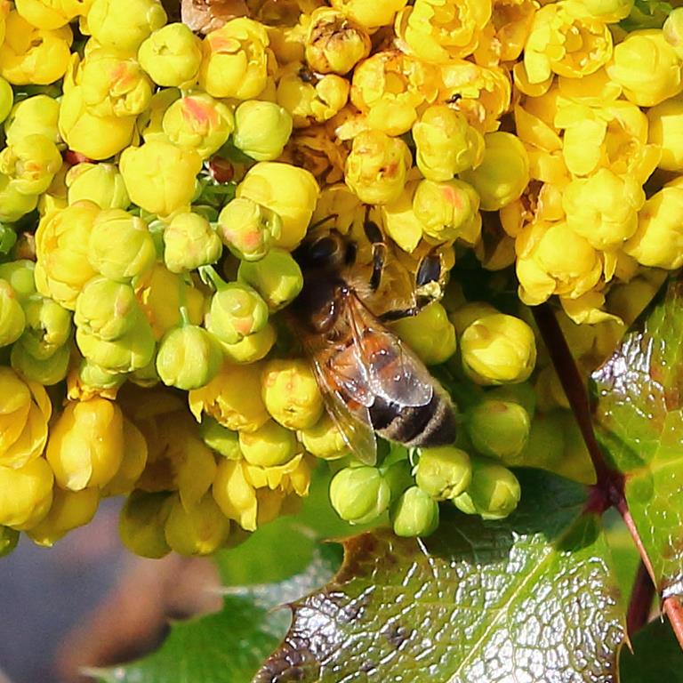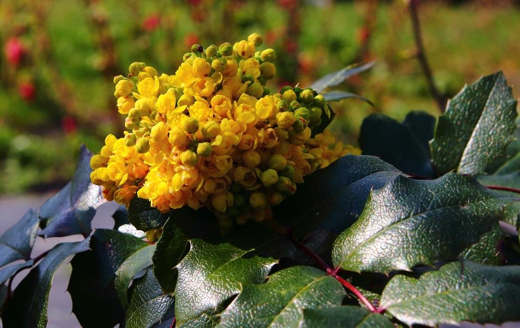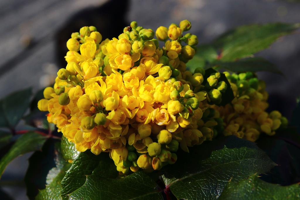 Opis. Zimozielony, niski krzew dorastający do 1,5 m wysokości. Pędy sztywne, gęsto ulistnione. Liście złożone pierzasto, skórzaste i błyszczące. Kwiaty żółte, drobne, zebrane w gęste, wiechowate kwiatostany. Kwitnie w maju. Owoce granatowe, owalne, z jasnoniebieskim woskowym nalotem. Dojrzewają w sierpniu.
