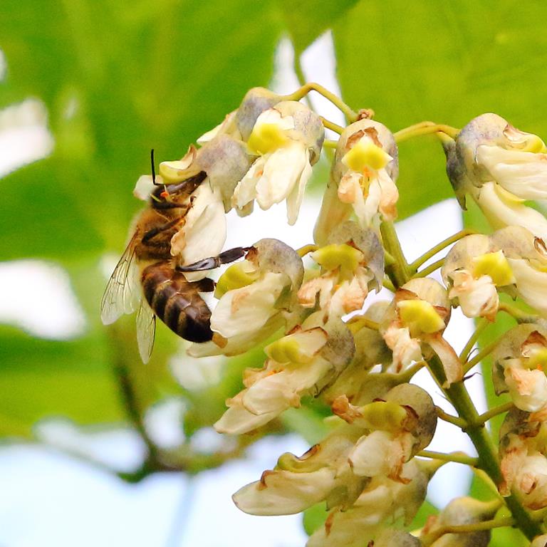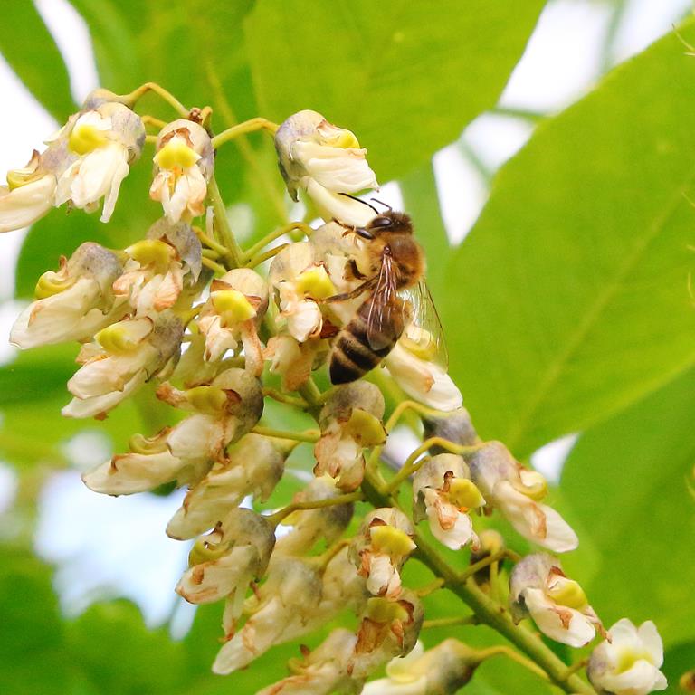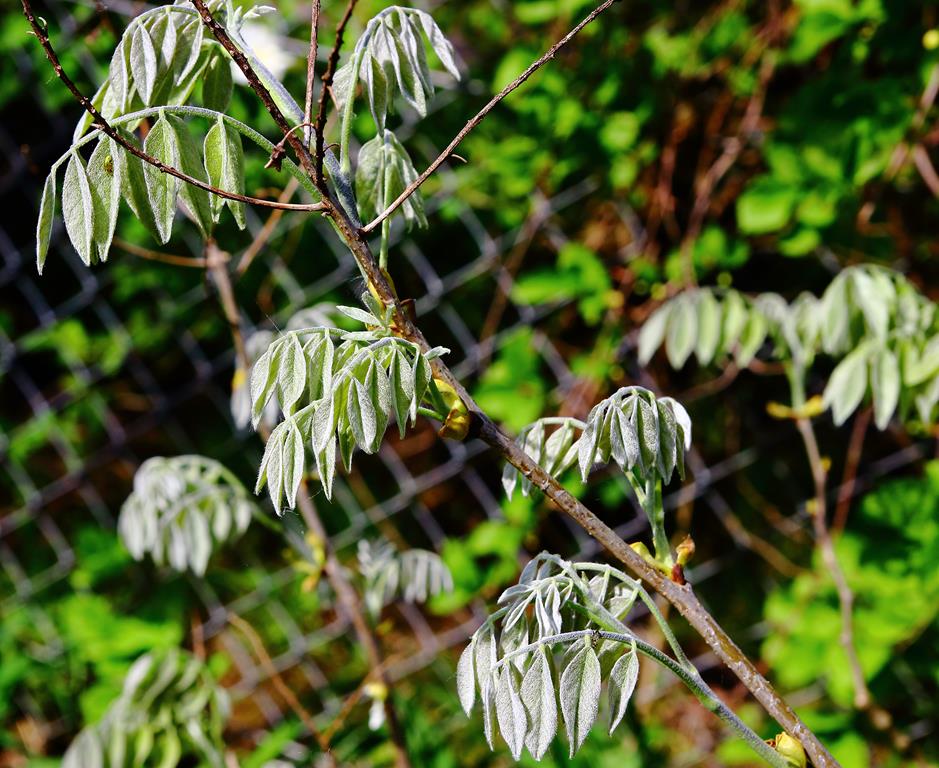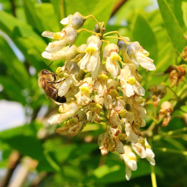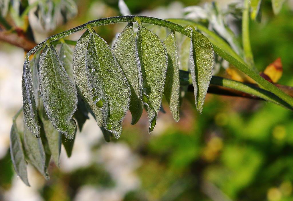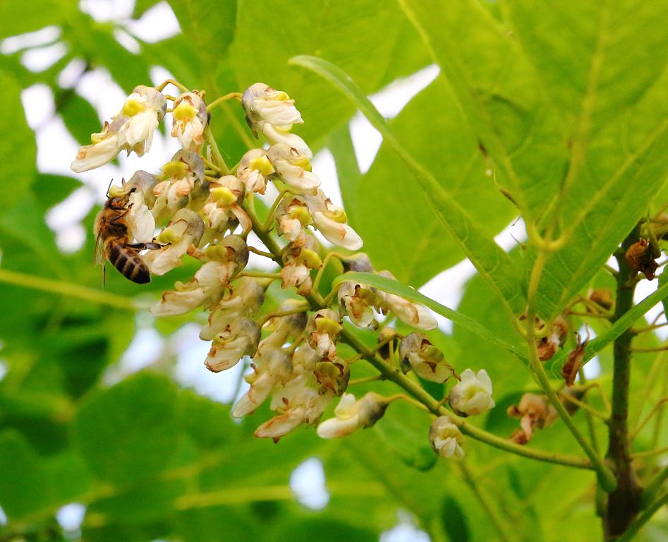 Opis. Niewysokie drzewo dorastające w naszych warunkach do 5-8 m wysokości. Korona luźna, nieregularna. Liście pierzaste, początkowo pokryte srebrzystymi włoskami, później nagie. Kwiaty białokremowe, drobne, w wyprostowanych kwiatostanach. Kwitnie w lipcu. Owoce w postaci brązowych, krótkich strąków.