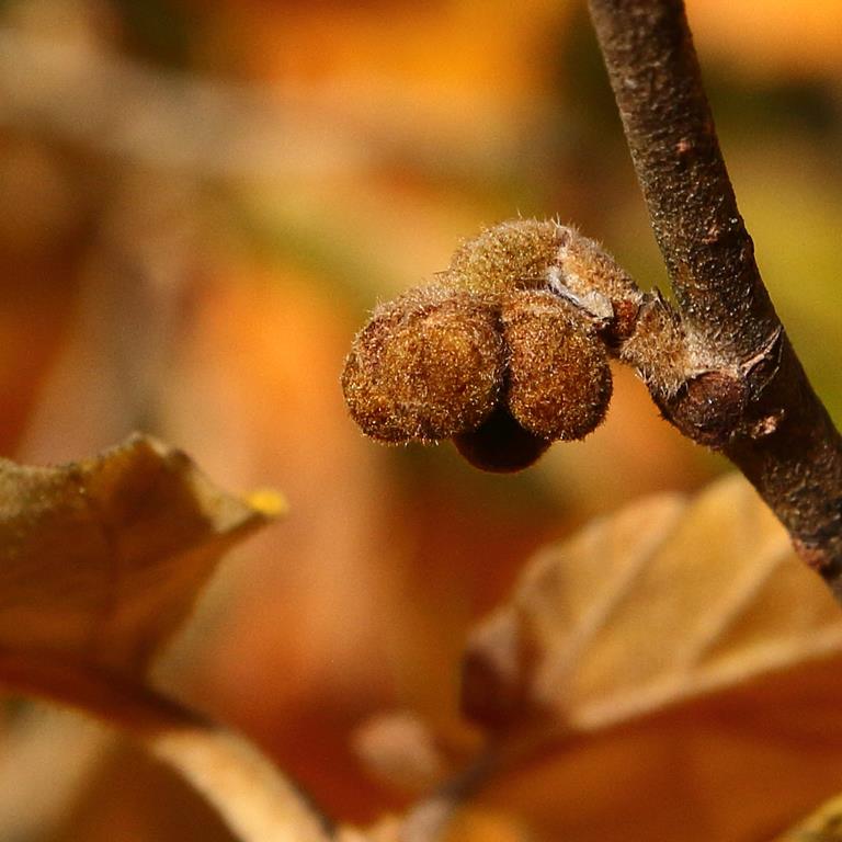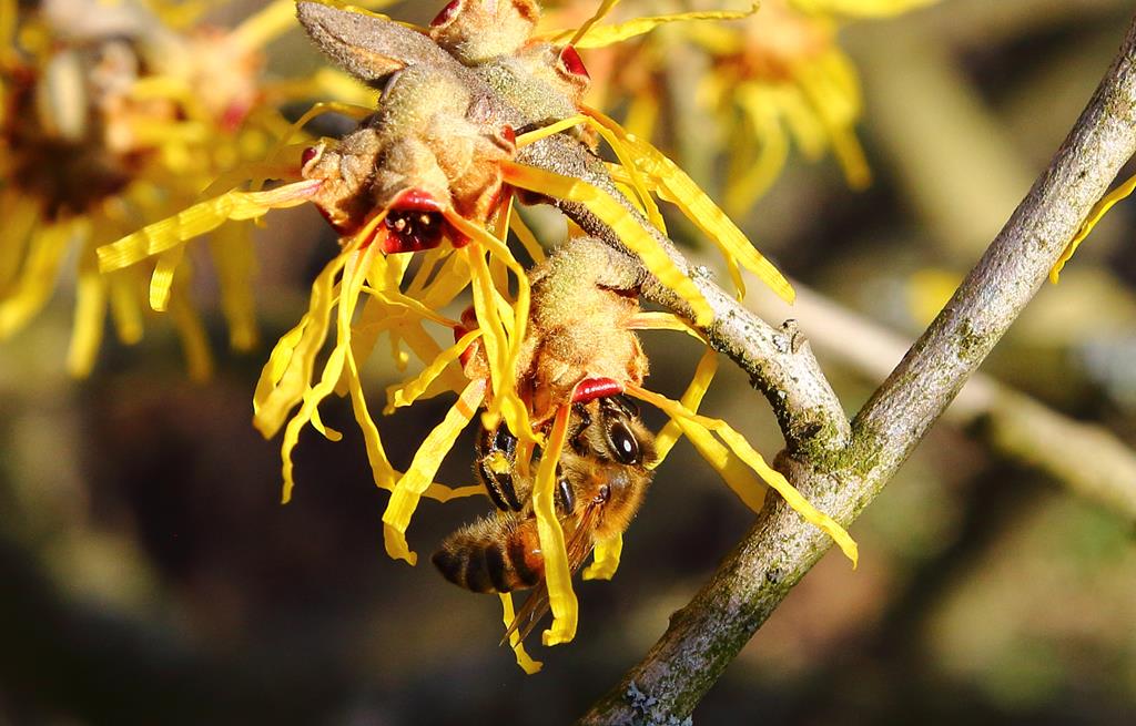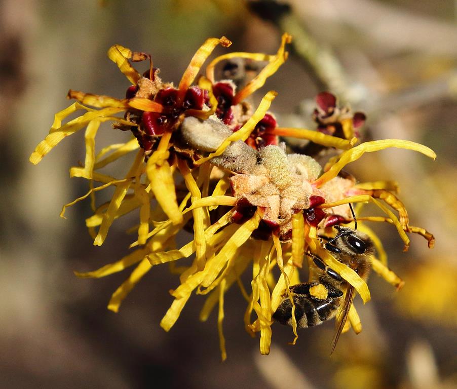 Opis. Wolno rosnący krzew o wysokości do 3-4 m. Pokrój szeroki, odwrotnie stożkowaty. Młode pędy i pąki miękko owłosione. Liście duże, owalne, długości 10-15 cm, jesienią intensywnie żółte. Kwiaty złocistożółte, frędzelkowate, mocno pachnące. Kwitnie obficie styczeń - marzec w czasie odwilży. Owocem są zdrewniałe torebki wypełnione czarnymi nasionami.