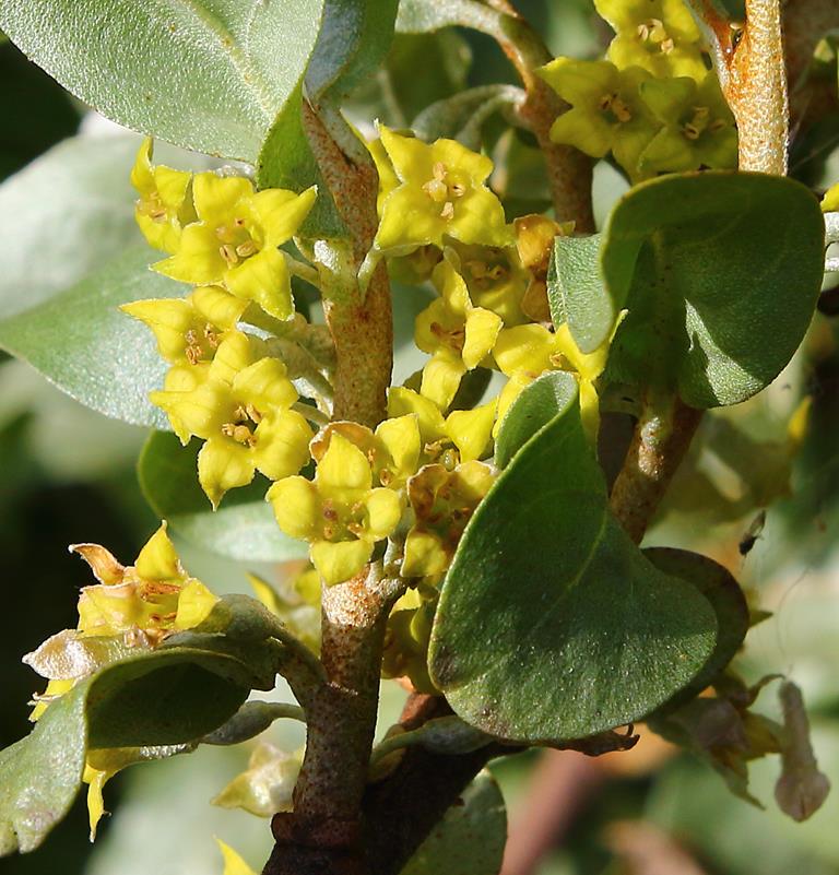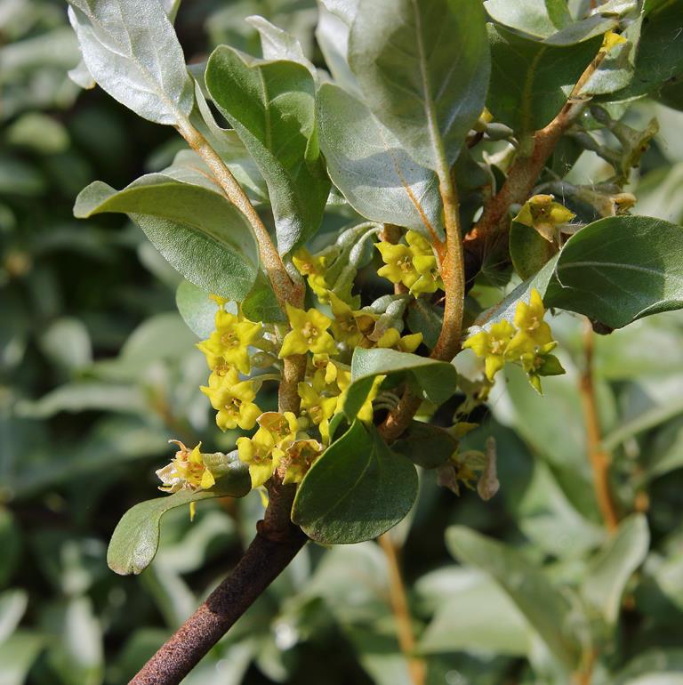 Opis. Krzew o rozłożystym, nieregularnym pokroju, dorastający do 2 m wysokości. Wytwarza odrosty korzeniowe. Liście eliptyczne, srebrzyste. Kwiaty drobne, żółtawe, liczne, zebrane po kila w kątach liści. Kwitnie w drugiej połowie maja przez ok 2-3 tyg. Owoce kuliste, srebrzyste, do 1 cm średnicy. Dojrzewają w sierpniu i wrześniu.