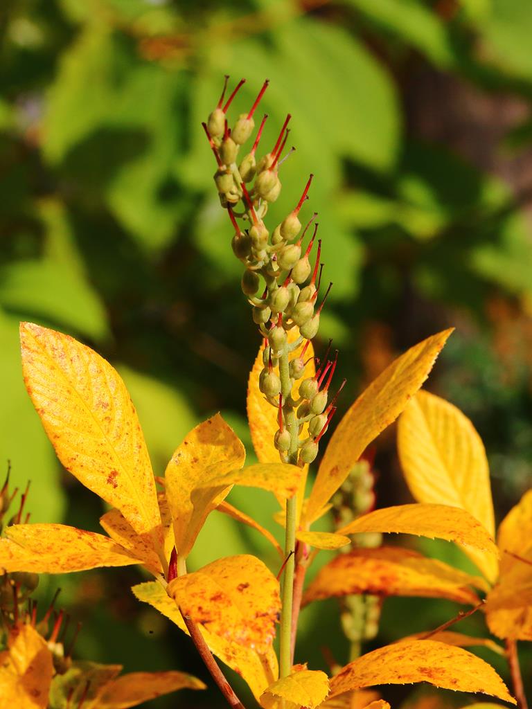 Opis. Krzew o sztywnych, wzniesionych pędach, dorastający do ok. 1,5-2 m wysokości. Pokrój gęsty, zwarty i zaokrąglony. Liście ciemnozielone, wąsko jajowate, ząbkowane, jesienią żółte. Kwiaty różowe, w miarę przekwitania bielejące, mocno pachnące, zebrane w szczytowe kłosowate kwiatostany o długości 10-15 cm. Kwitnie obficie w lipcu i sierpniu.