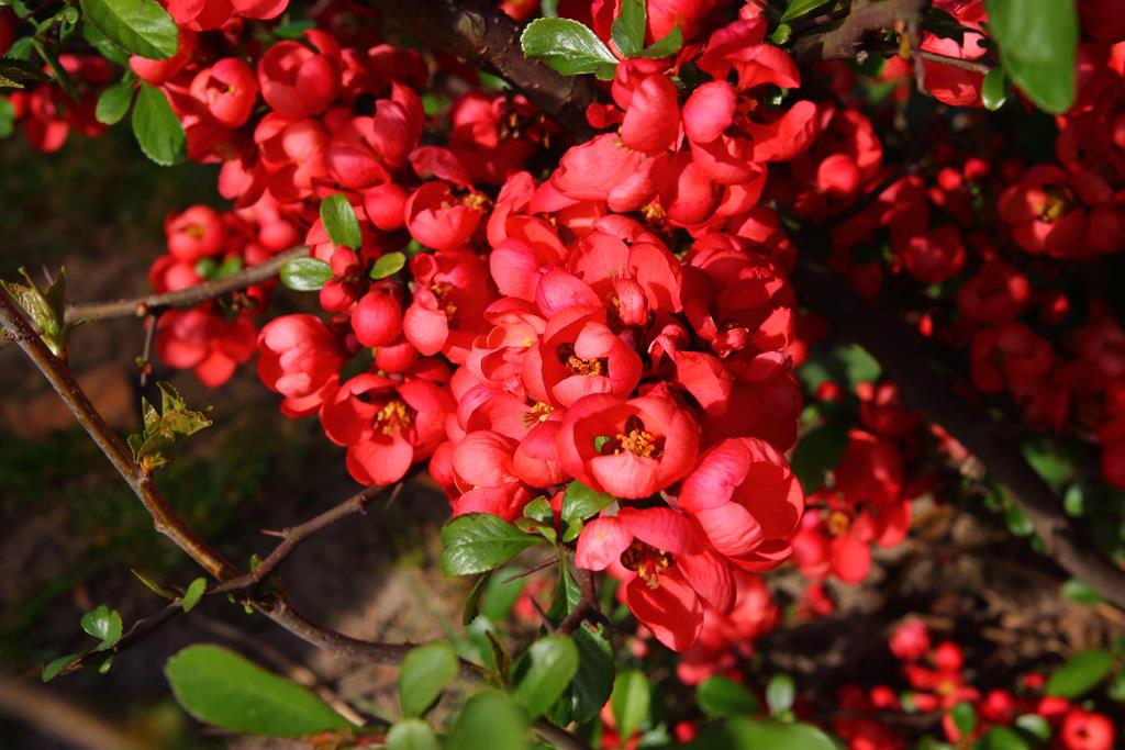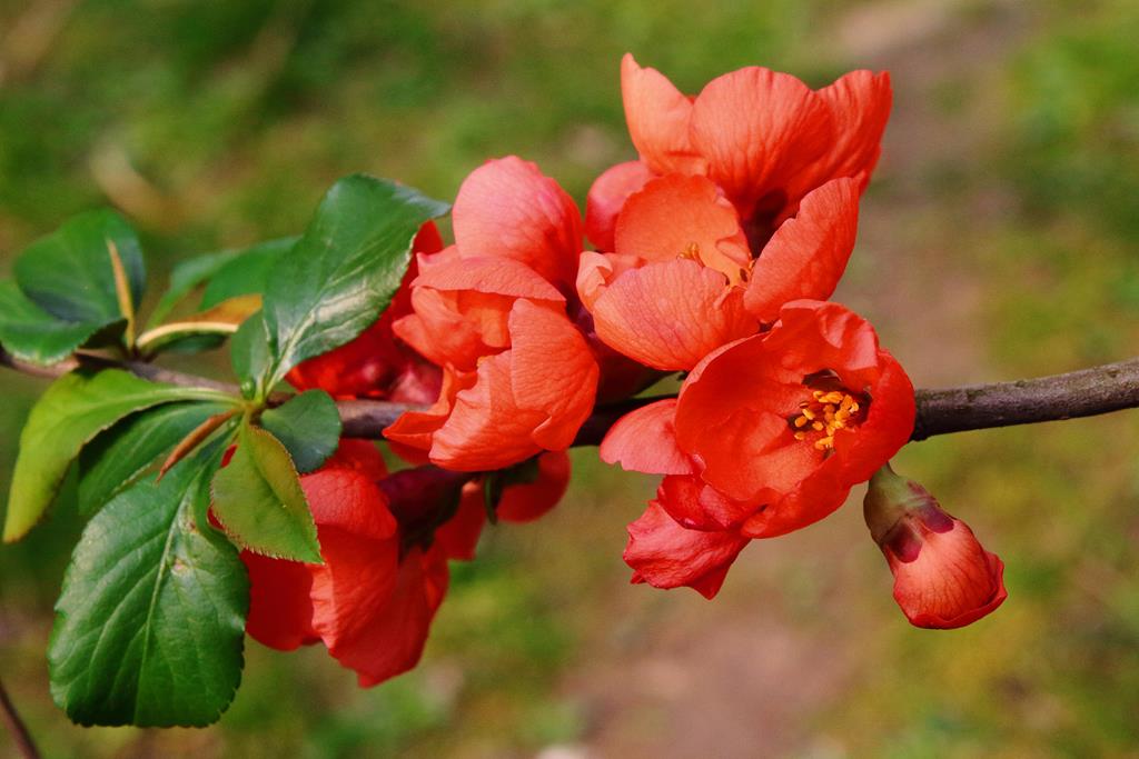 Opis. Niewysoki, rozłożysty krzew dorastający do 1,5 m wysokości. Pędy pokryte krótkimi cierniami. Liście ciemnozielone, jajowate, błyszczące. Kwitnie w kwietniu-maju. Kwiaty średnicy ok. 3 cm, ceglastoczerwone, bardzo liczne. Owoce zielonożółte, drobne, kuliste, dojrzewają we wrześniu.