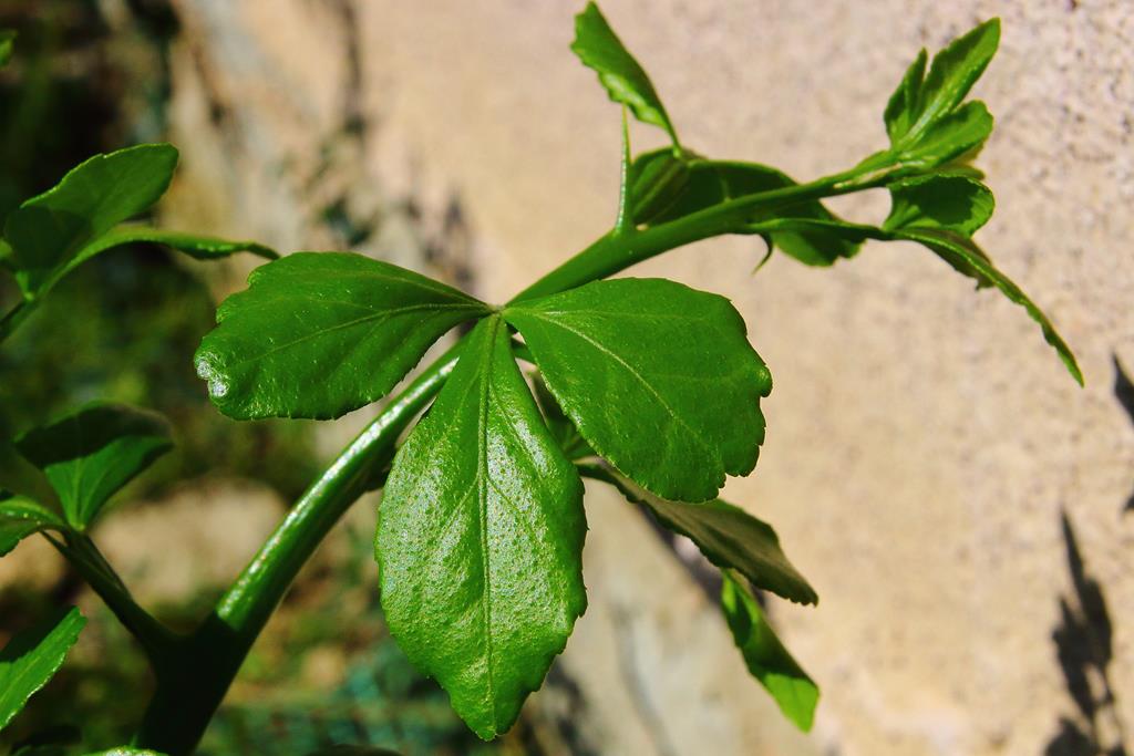 Opis. Krzew dorastający w naszych warunkach do ok. 3 metrów wysokości. Pędy ciemnozielone, spłaszczone, cierniste. Liście zielone, sezonowe, złożone z trzech owalnych listków. Kwiaty małe, białe, pięciopłatkowe, lekko pachnące. Kwitnie w kwietniu i maju. Owoce nieduże, kuliste, żółte, kwaśne, dojrzewają jesienią.