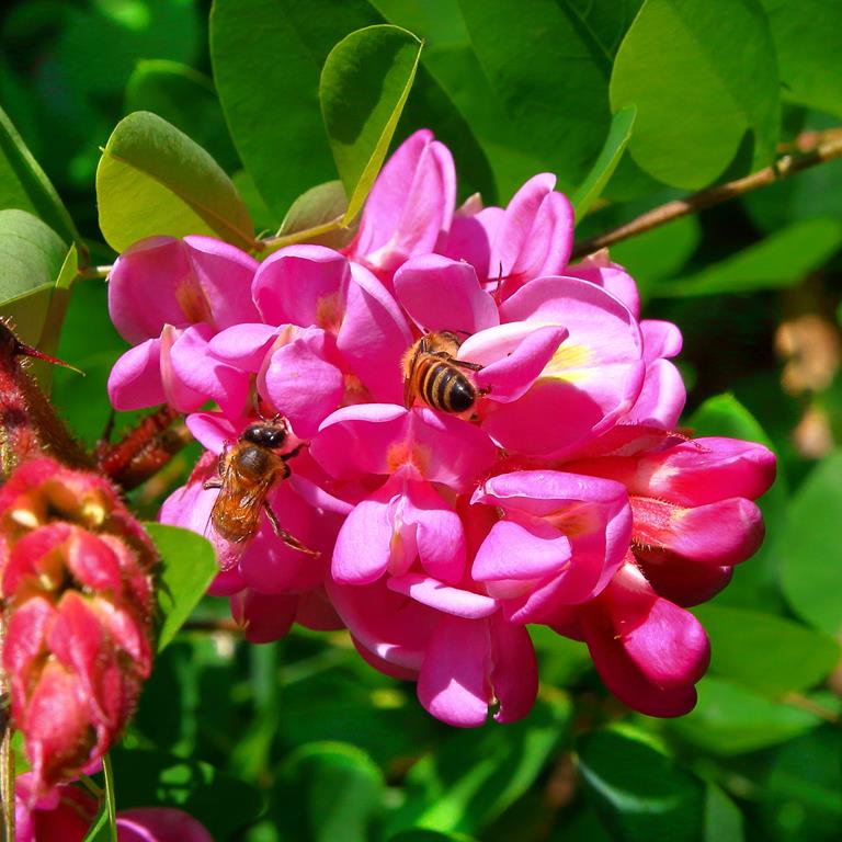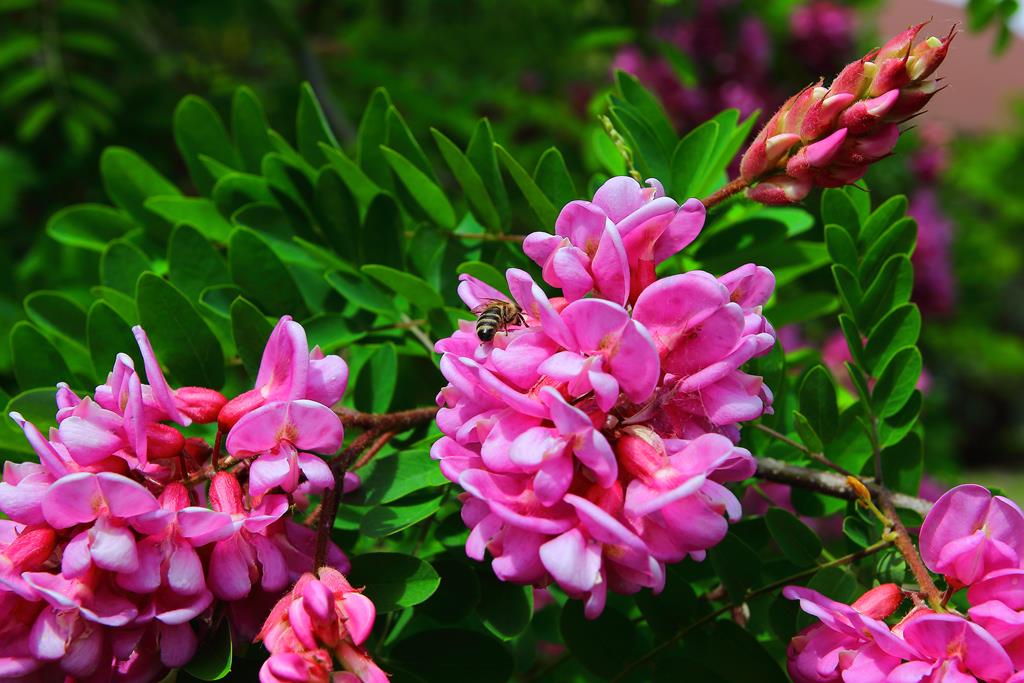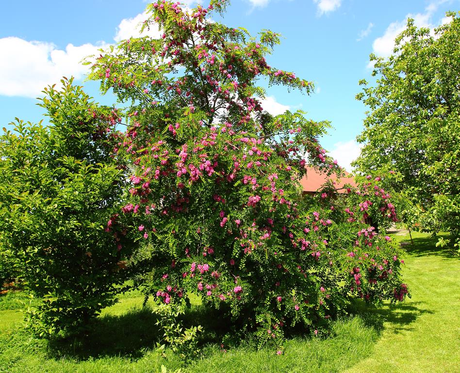 Opis. Niewielkie, cierniste drzewo o kulistej, gęstej koronie dorastające do 12 m wysokości. Liście pierzaste, złożone z kilkunastu eliptycznych listków. Kwiaty różowe, zebrane w krótkie, gęste, zwisające kwiatostany. Zakwita w drugiej połowie maja i kwitnie do końca lata. Najmłodsze pędy, osie kwiatostanowe oraz strąki pokryte gruczołkowatymi, lepkimi włoskami.