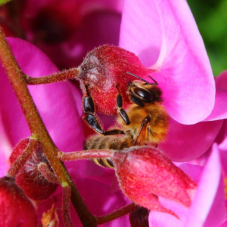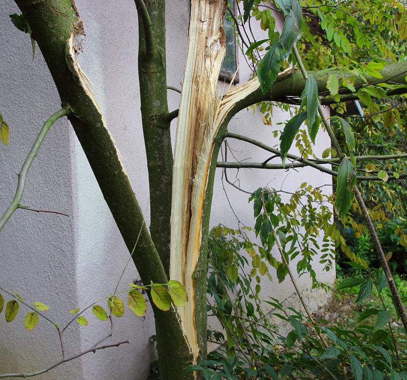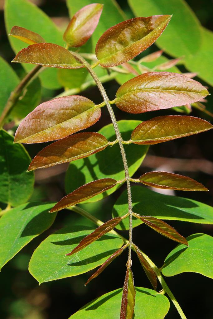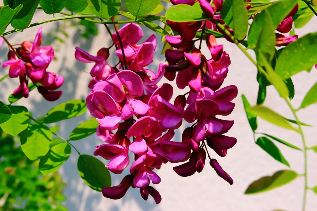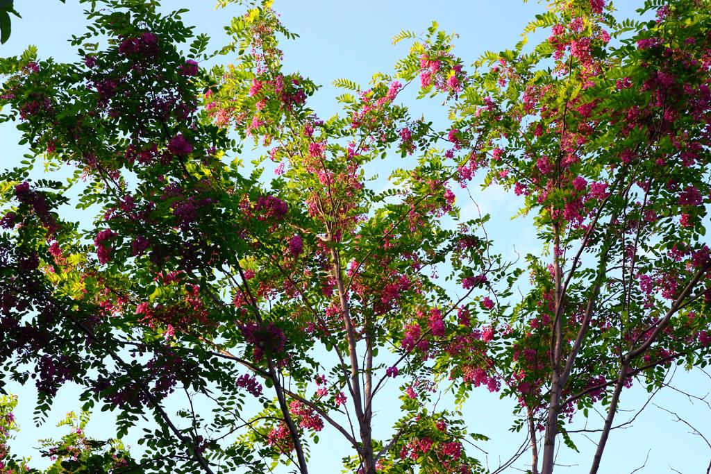Opis. Drzewo o wysokości 9-15 m. Korona luźna, szeroka, pędy wyprostowane, z małą ilością cierni. Liście pierzaste, złożone z eliptycznych, jasnozielonych listków. Kwiaty ciemnoróżowe, motylkowate, zebrane w liczne, zwisające grona. Kwitnie bardzo obficie na przełomie maja i czerwca.