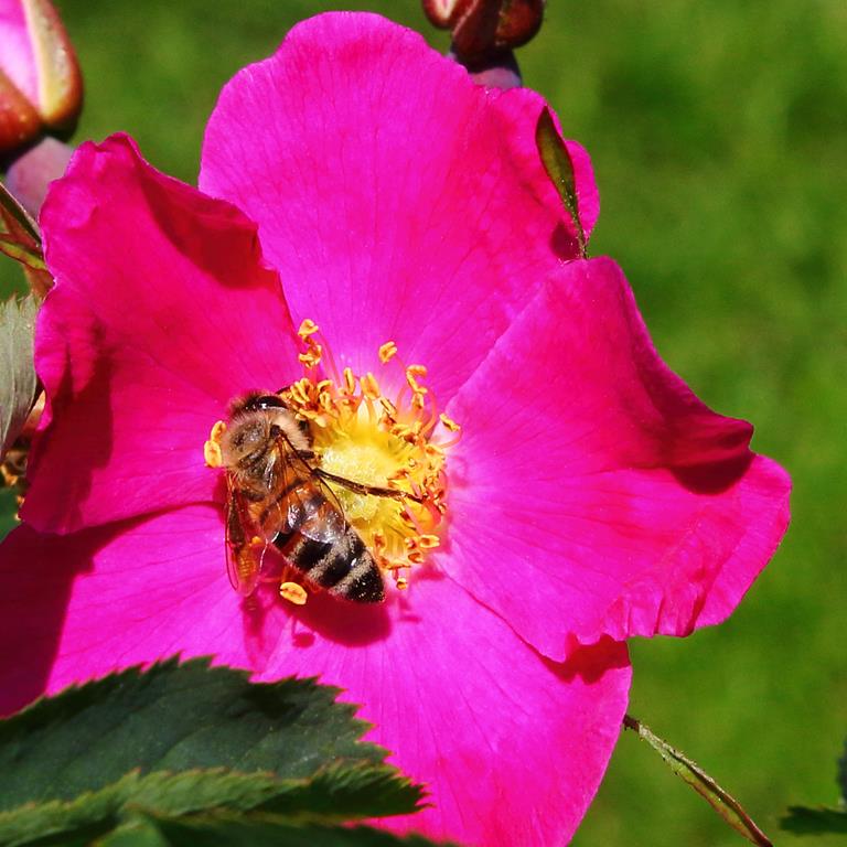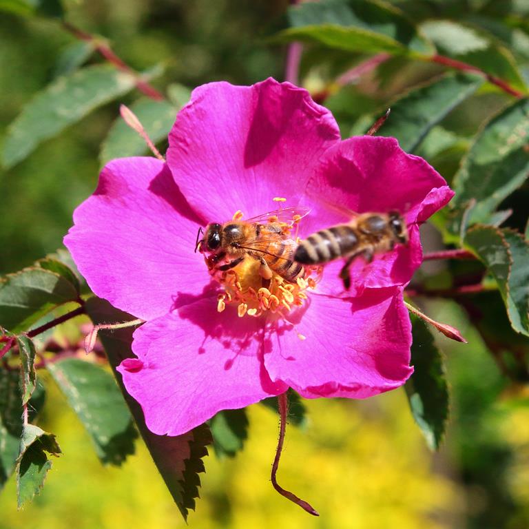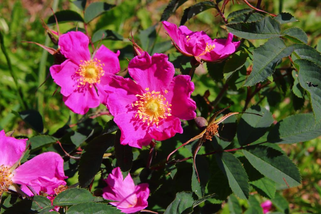 Kwiaty: ciemnoróżowe, pojedyncze, słabo pachnące, średnicy ok. 5 cm, VI
