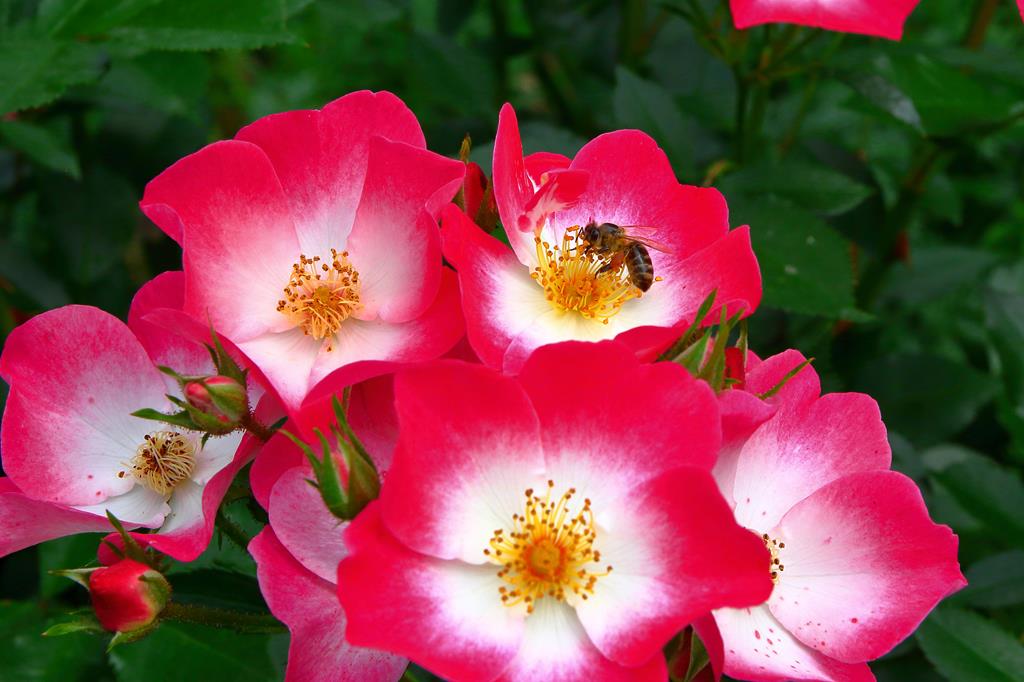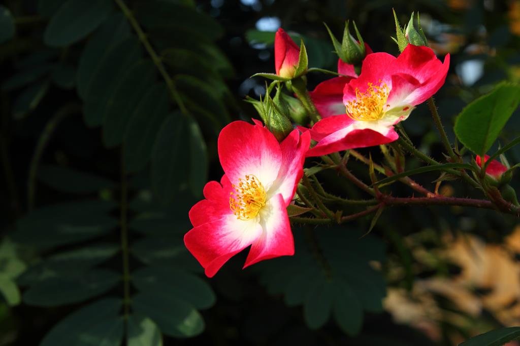 Kwiaty: czerwone z białym środkiem, pojedyncze, średnicy ok. 5 cm, zebrane w okazałe grona, VI-X