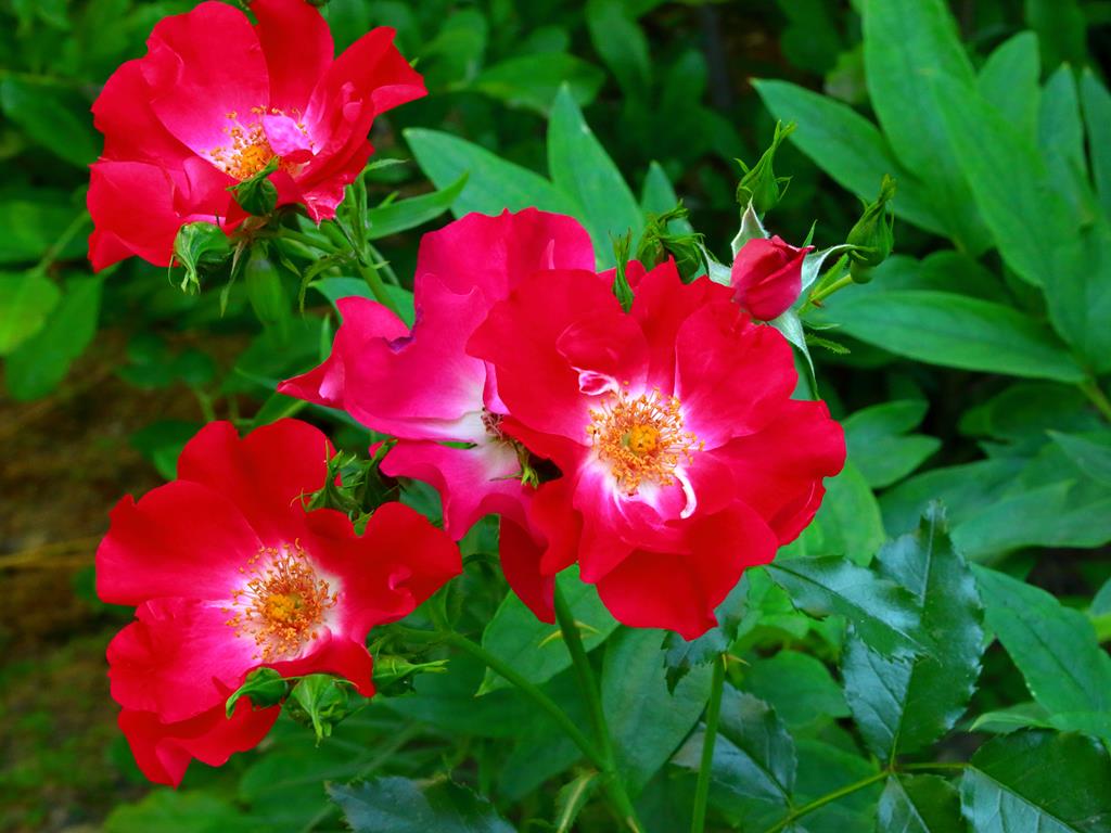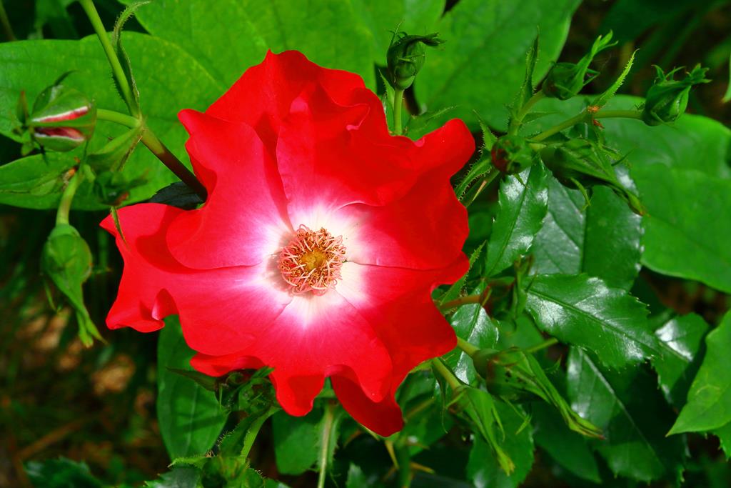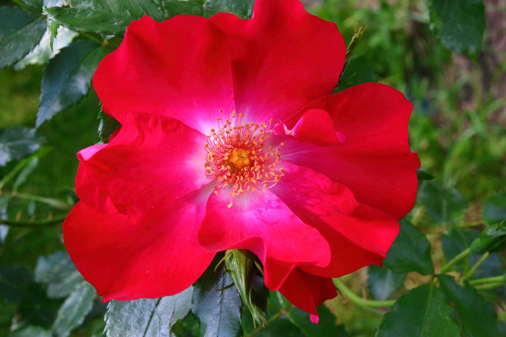 Kwiaty: czerwone z białym środkiem, 10 cm średnicy, pojedyncze, VI-IX