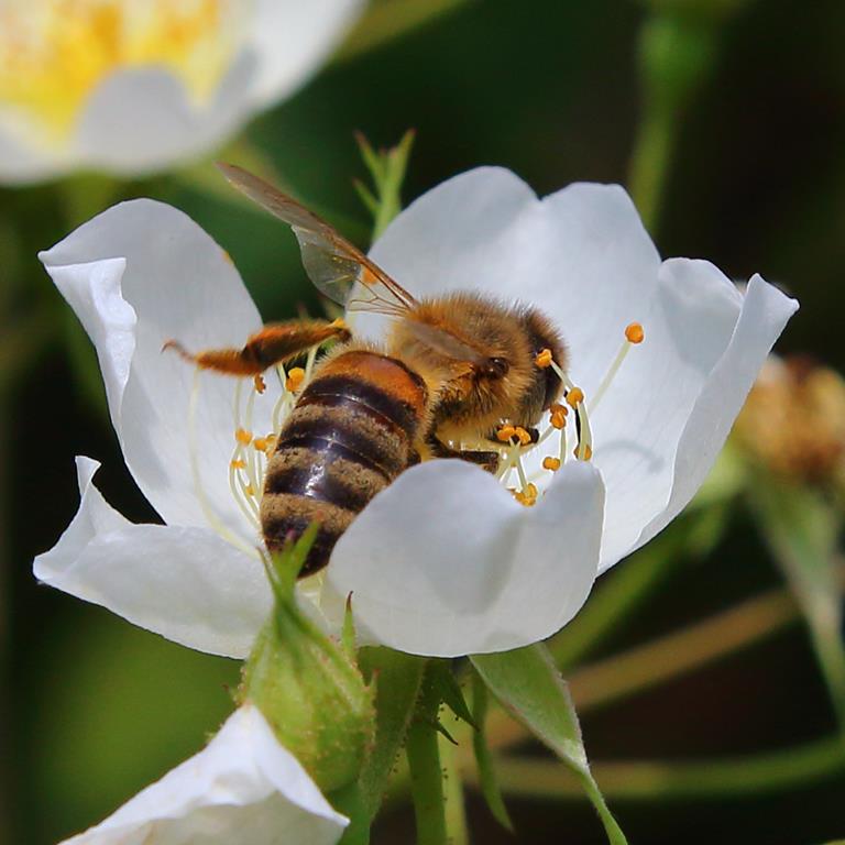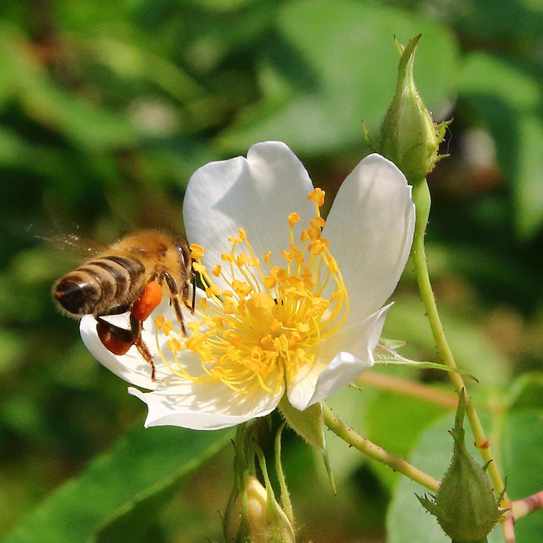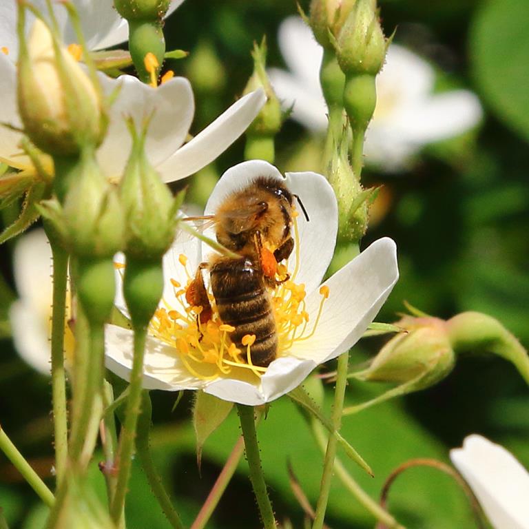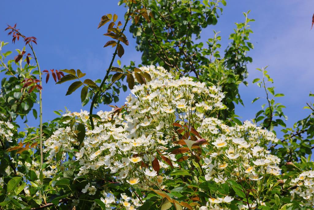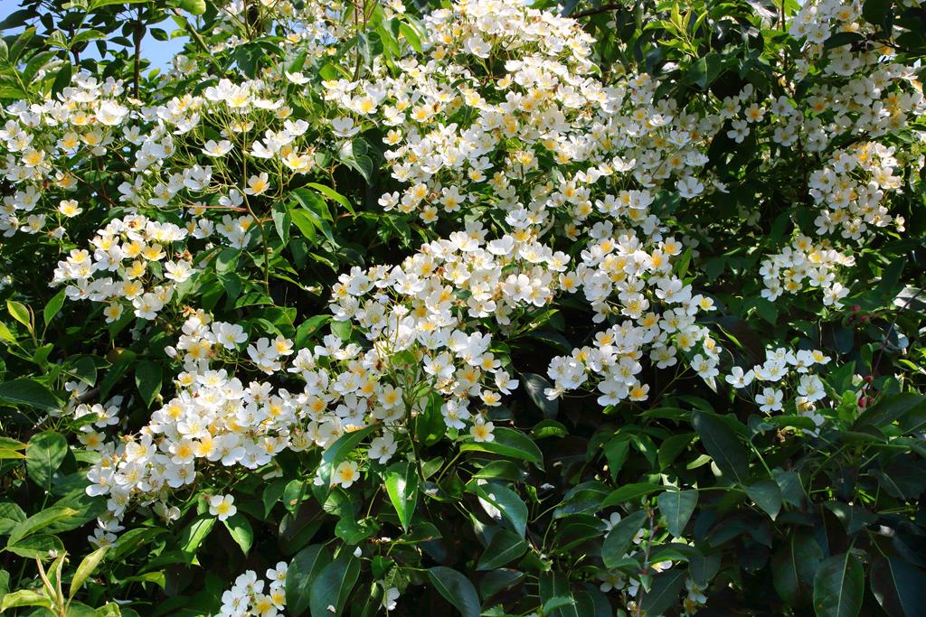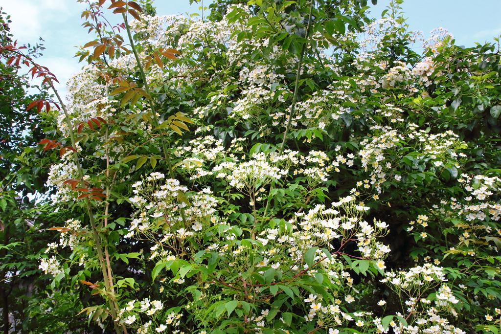 Kwiaty: białe z żółtymi pylnikami, pojedyncze, średnicy 3-4 cm, zebrane w duże kwiatostany, VI