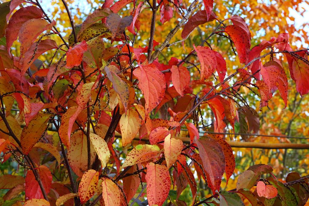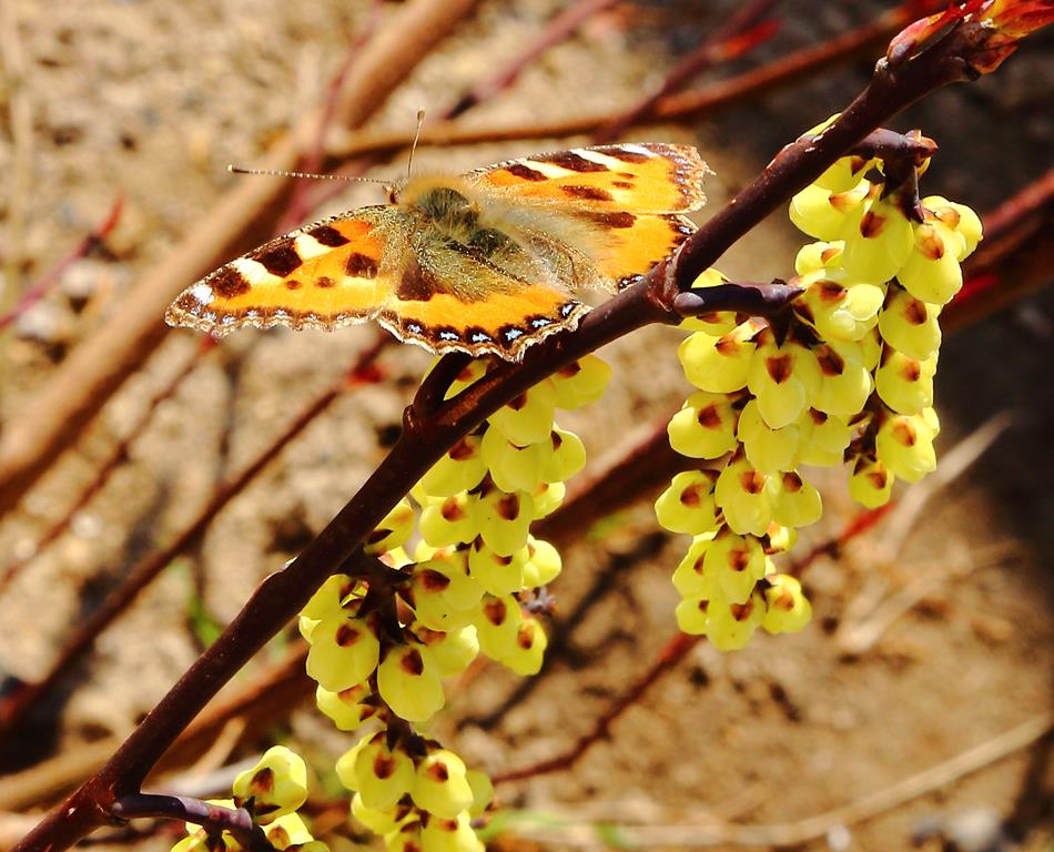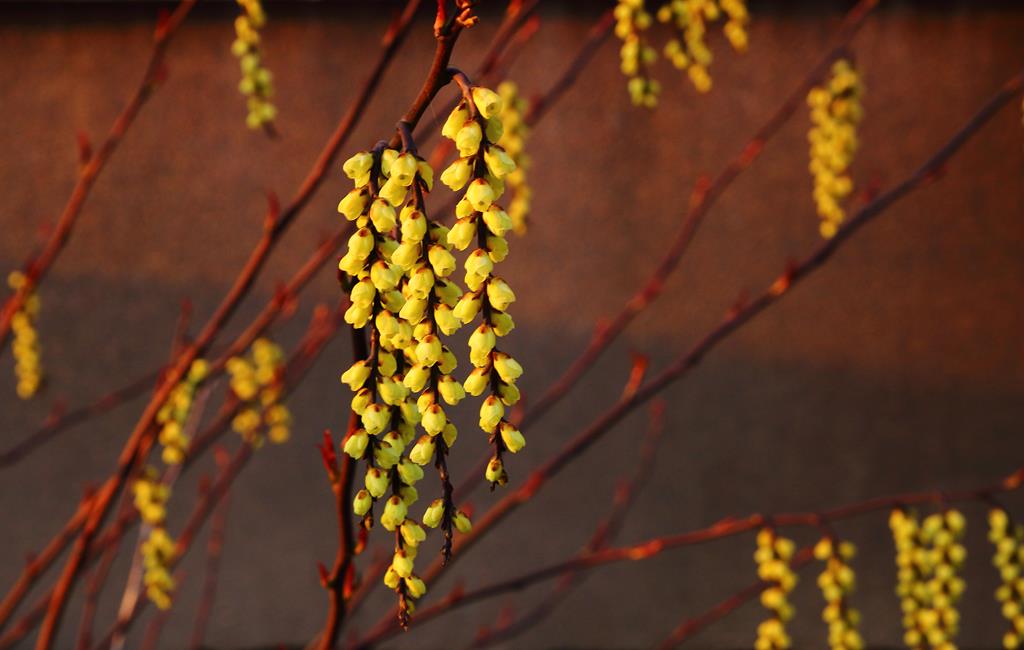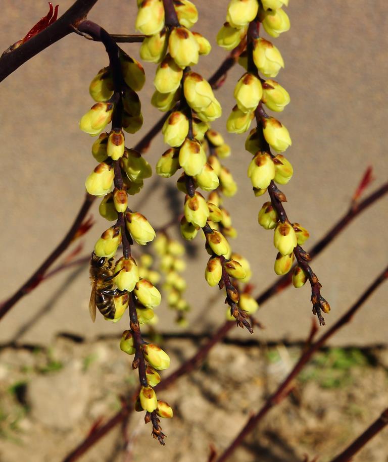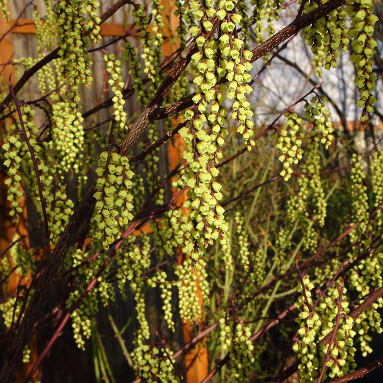 Opis. Krzew wysokości do 3 m i szerokości do 2-3 m. Pędy, czerwonobrązowe, gładkie, błyszczące, pokrój wzniesiony. Liście owalne, ząbkowane, jesienią czerwone. Kwiaty zielonkawożółte, dzwonkowate, zebrane w zwisające grona długości do 12 cm. Kwitnie bardzo obficie na przełomie marca i kwietnia.