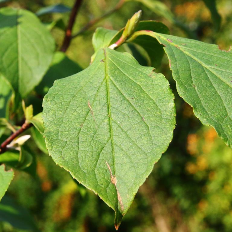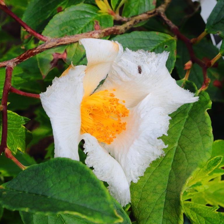Opis. Krzew dorastający do wysokości 4 m. Liście ciemnozielone, eliptyczne lub jajowate, długości do 9 cm. Kwiaty białe z żółto-pomarańczowymi pylnikami, miseczkowate, średnicy do 7 cm. Zakwita w połowie czerwca i kwitnie przez około 6 tygodni.