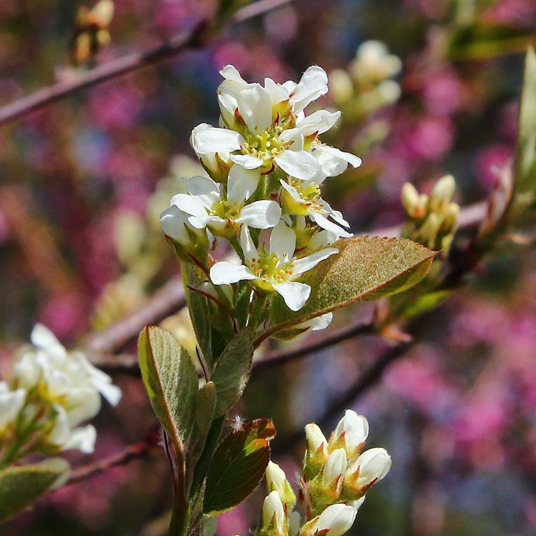 Opis. Krzew dorastający do 4-5 m wysokości o pędach zwykle prosto wzniesionych. Liście eliptyczne, szarozielone. Kwiaty białe, zebrane w krótkie grona. Kwitnie bardzo obficie na przełomie kwietnia i maja. Owoce kuliste, granatowe, jadalne.