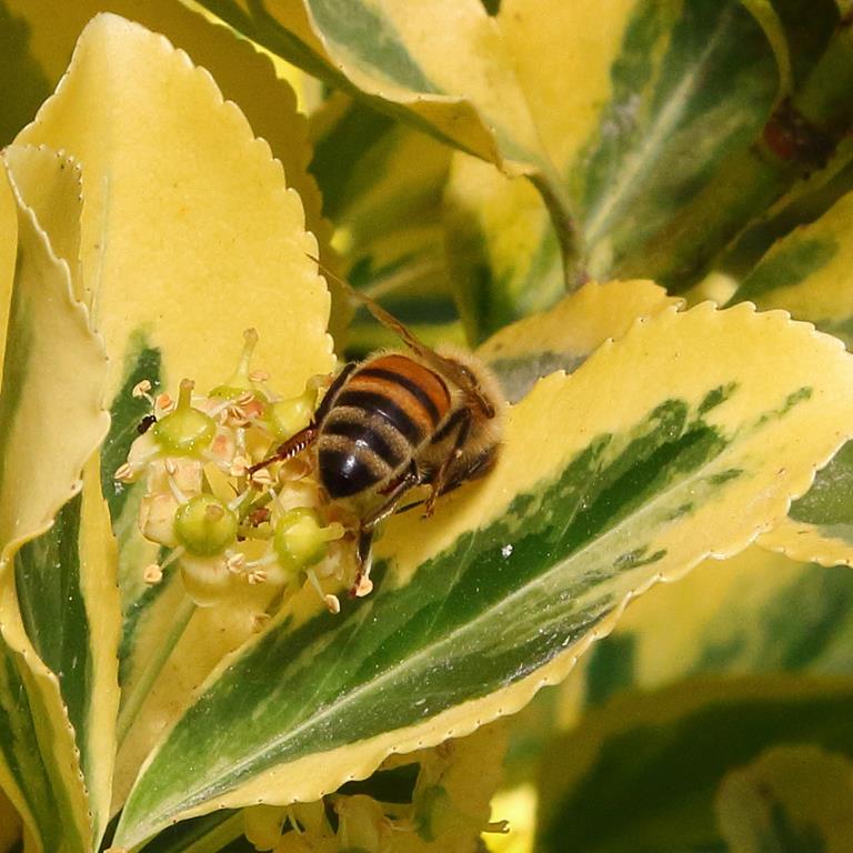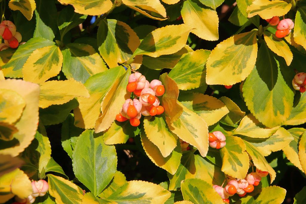 Opis. Wolno rosnący krzew dorastający do wysokości 3-4 m. Pędy zielone, płożące z korzeniami przybyszowymi. Liście zimotrwałe, skórzaste, zielone, z żółtym, nieregularnym marginesem. Wykazuje niewielką skłonność do rewersji (część liści bez przebarwień). Kwiaty zielonkawobiałe, niepozorne, rozwijają się w czerwcu. Owoce drobne, pomarańczowe, liczne, dojrzewają w październiku.