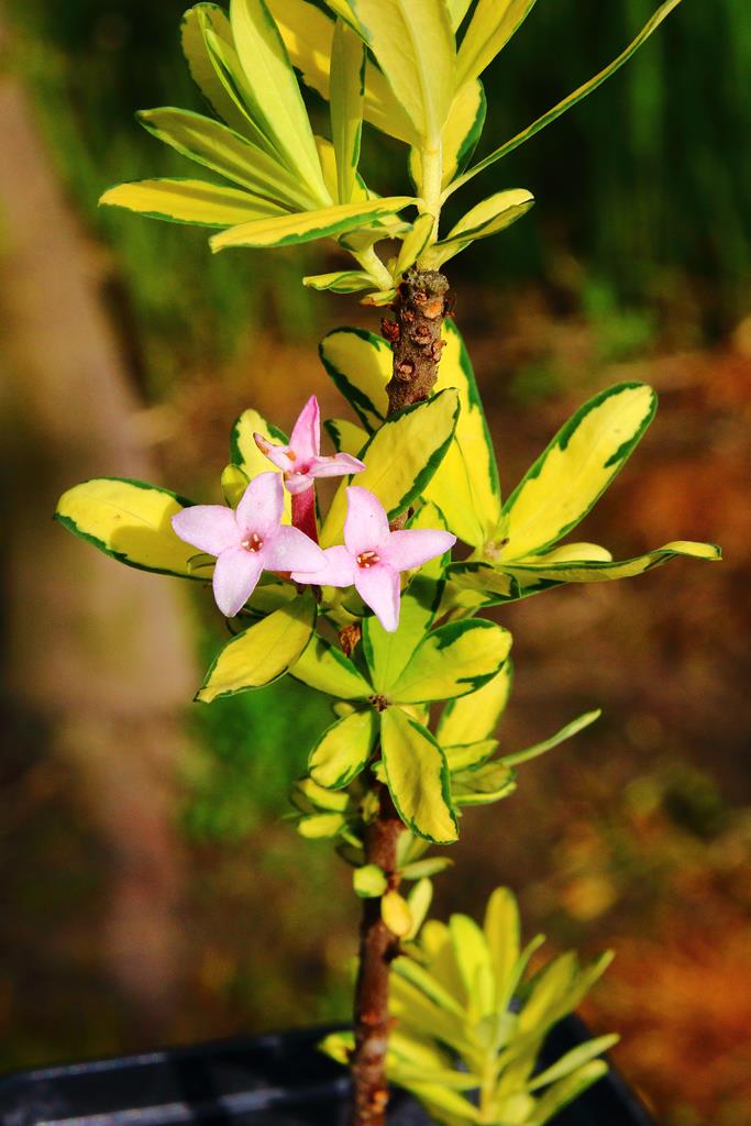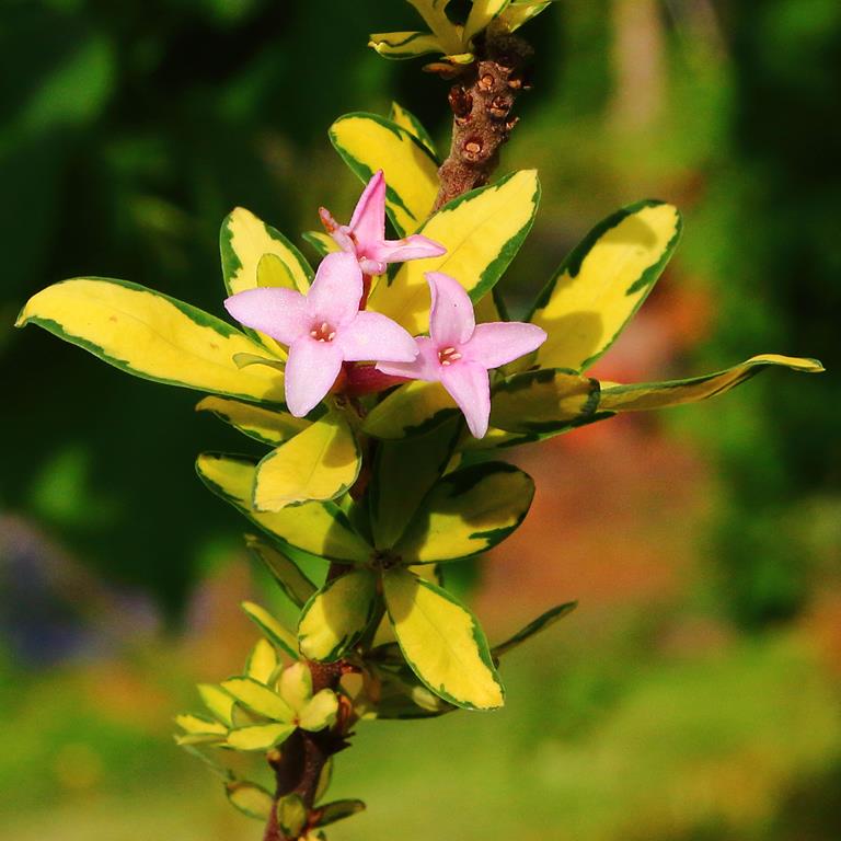 Opis. Niski, częściowo zimozielony krzew, osiągający do 1 m wysokości i podobnej szerokości. Liście lancetowate, intensywnie żółte z zielonym marginesem. Kwiaty mocno pachnące, drobne, białoróżowe, zebrane w główkowe kwiatostany na szczytach pędów. Kwitnie w maju-czerwcu.