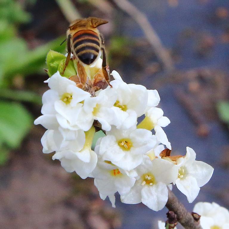 Opis. Forma o białych kwiatach i żółtych owocach. Pokrój zwarty, osiąga 1 m wysokości. Kwiaty bardzo liczne, silnie pachnące. Kwitnie marzec-kwiecień. Owoce kuliste, silnie trujące.