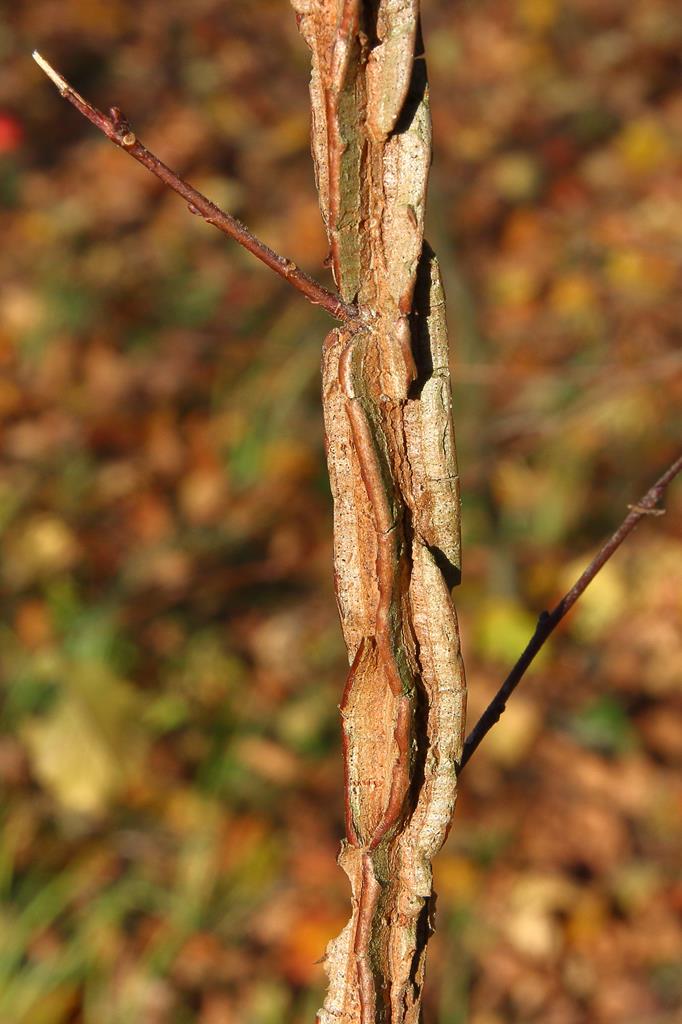 Opis. Drzewo dorastające do około 20 m wysokości. Korona wąska, pędy wzniesione, pokryte grubymi naroślami korkowymi. Kwiaty czerwonawe, małe, wiatropylne, zebrane w gęste pęczki na krótkich szypułkach. Kwitnie na przełomie marca i kwietnia. Owoce w postaci oskrzydlonych orzeszków.