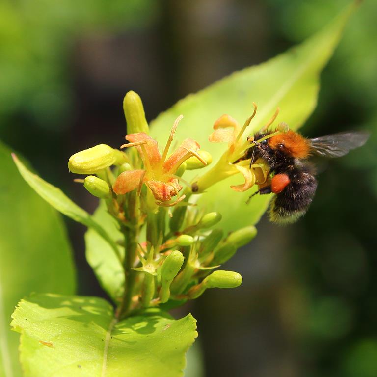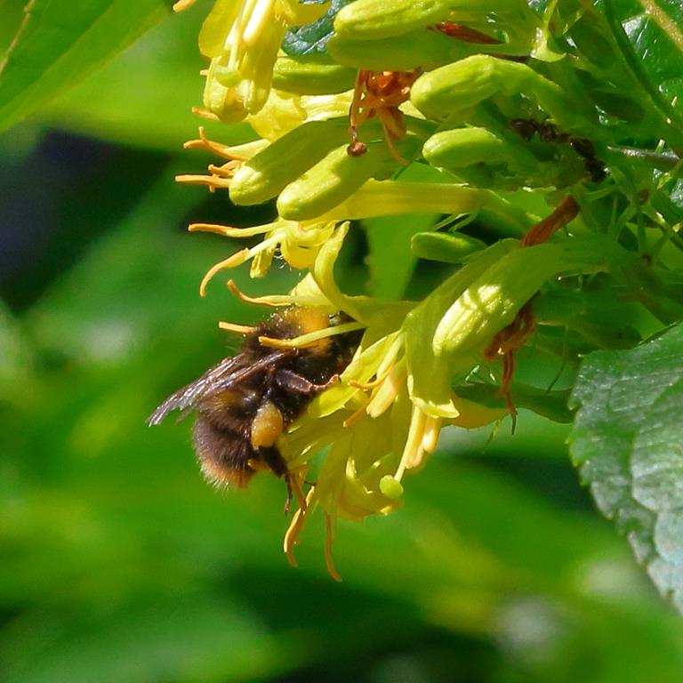 Opis. Niewysoki, zwarty krzew, o pokroju kulistym, dorastający do 1,5 m wysokości. Liście bezogonkowe, ciemnozielone. Kwiaty żółte, dwuwargowe, zebrane w szczytowe kwiatostany. Kwitnie czerwiec-sierpień.