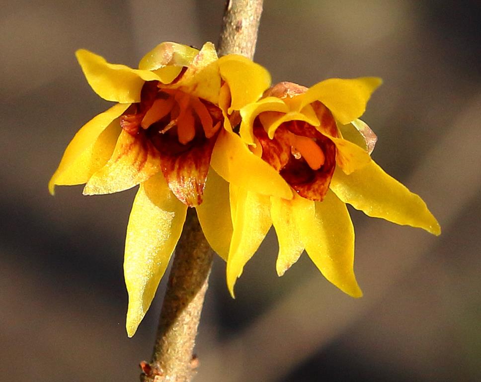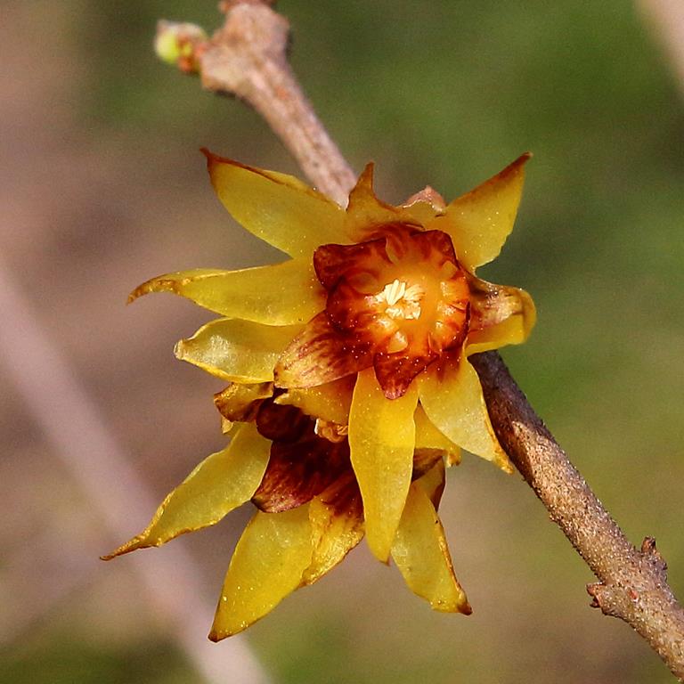 Opis. Krzew dorastający do 3-4 m wysokości. Pokrój wyprostowany, nieregularny. Liście szeroko lancetowate, długości do 20 cm. Kwiaty dzwonkowate, żółte z purpurowobrązowym środkiem, wonne. Pojawiają się na pędach co najmniej dwuletnich w marcu.
