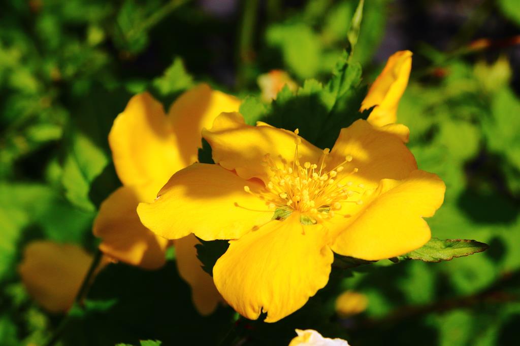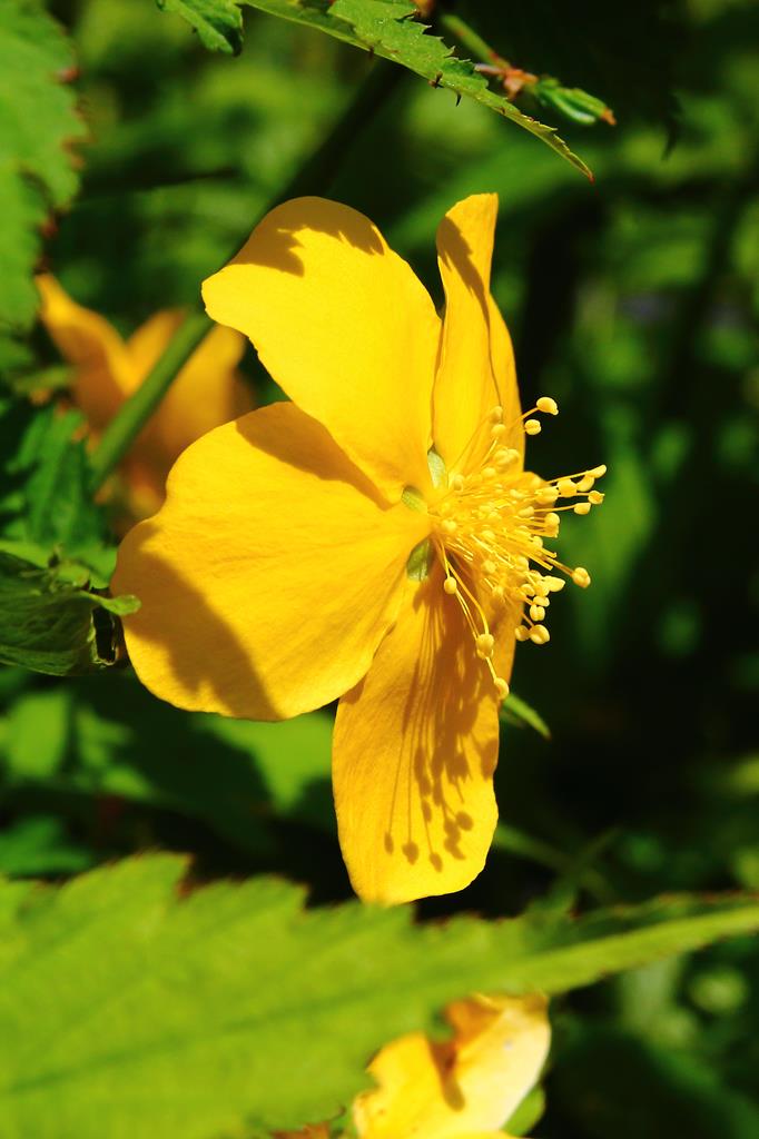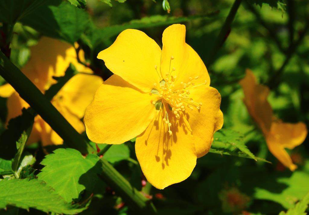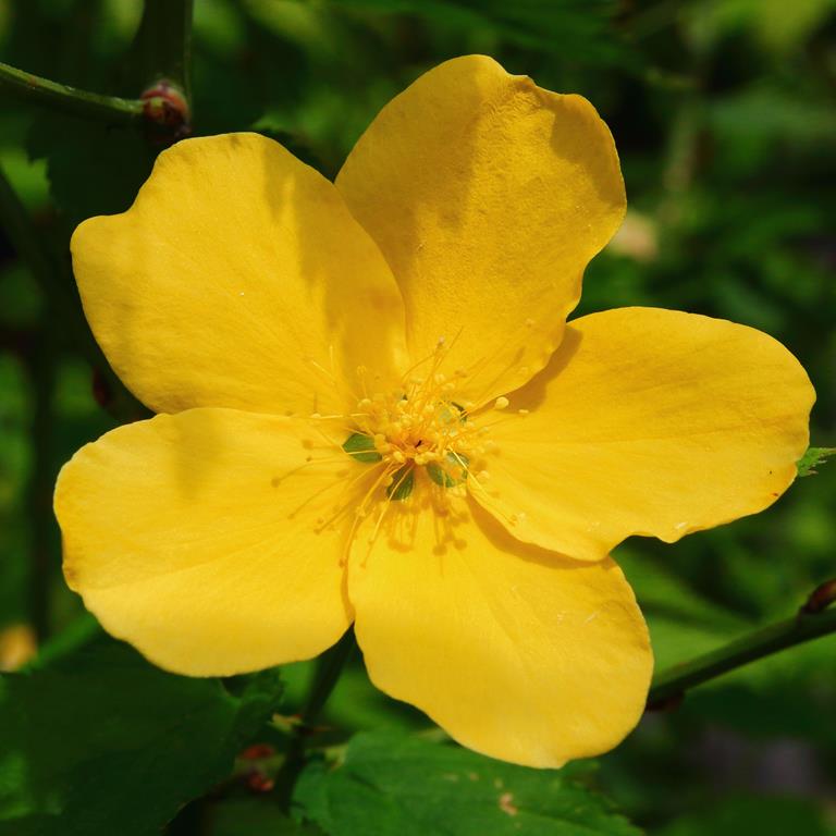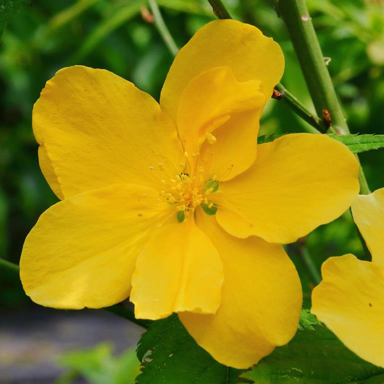 Opis. Gęsty krzew tworzący zarośla do wysokości 1,5 m. Pędy wyprostowane, zielone, słabo rozgałęzione. Liście jasnozielone, jajowate, na szczycie zaostrzone. Kwiaty żółte, 5-płatkowe, pojawiają się pojedynczo na szczytach krótkopędów. Kwitnie w maju.