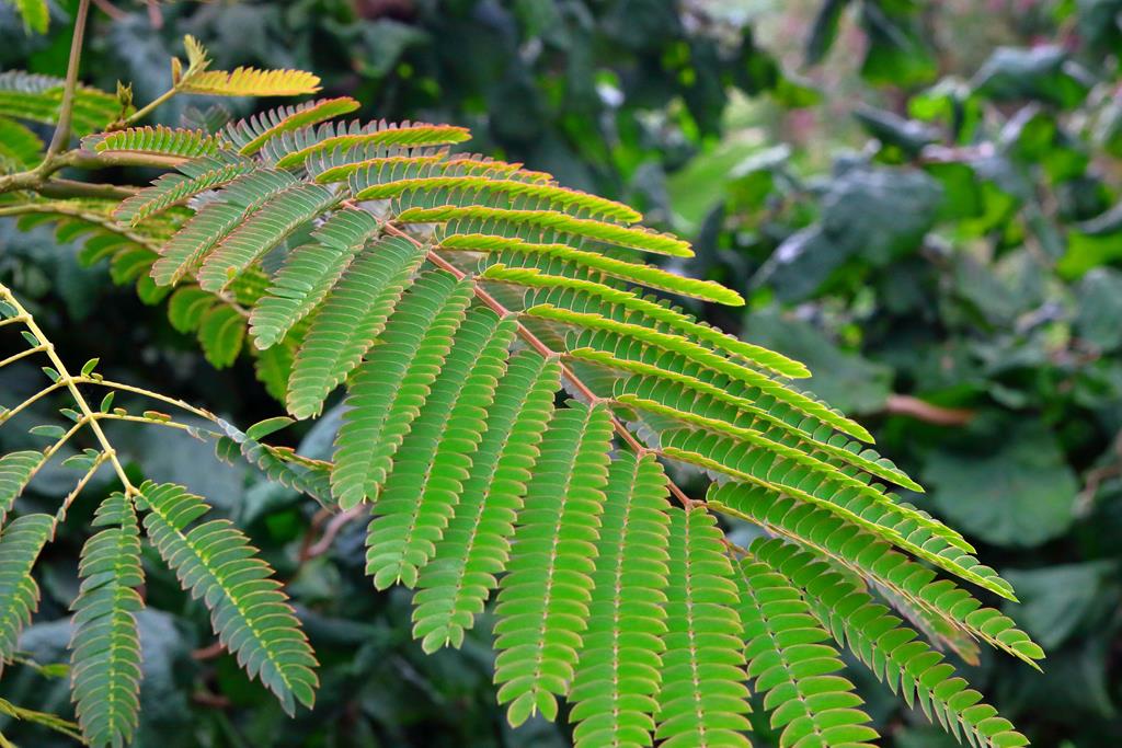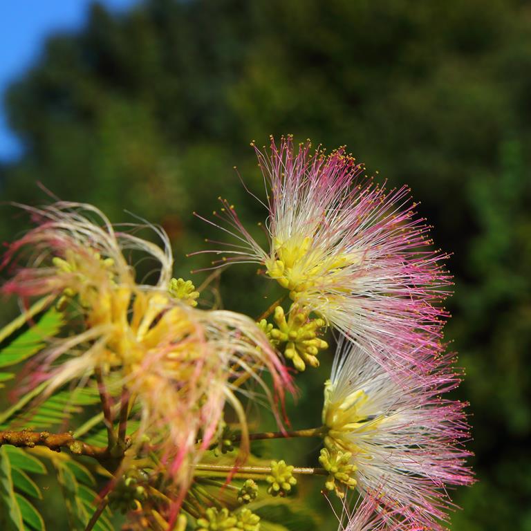 Opis. Krótkowieczne drzewo o rozłożystym, parasolowatym pokroju. W naturze dorasta do 12 m wysokości. Liście pierzastozłożone, duże, do 45 cm długości. Kwiaty różowe, bezpłatkowe, z długimi różowymi pręcikami, zebrane w główkowate kwiatostany na szczytach pędów. Kwitnie od lipca do początku września.