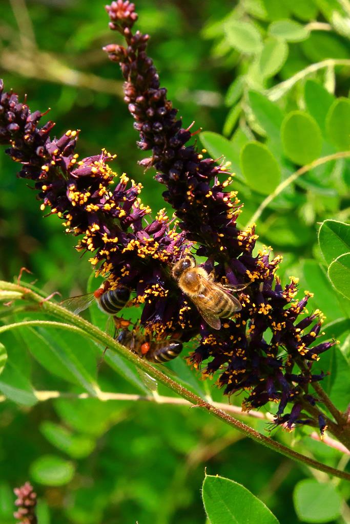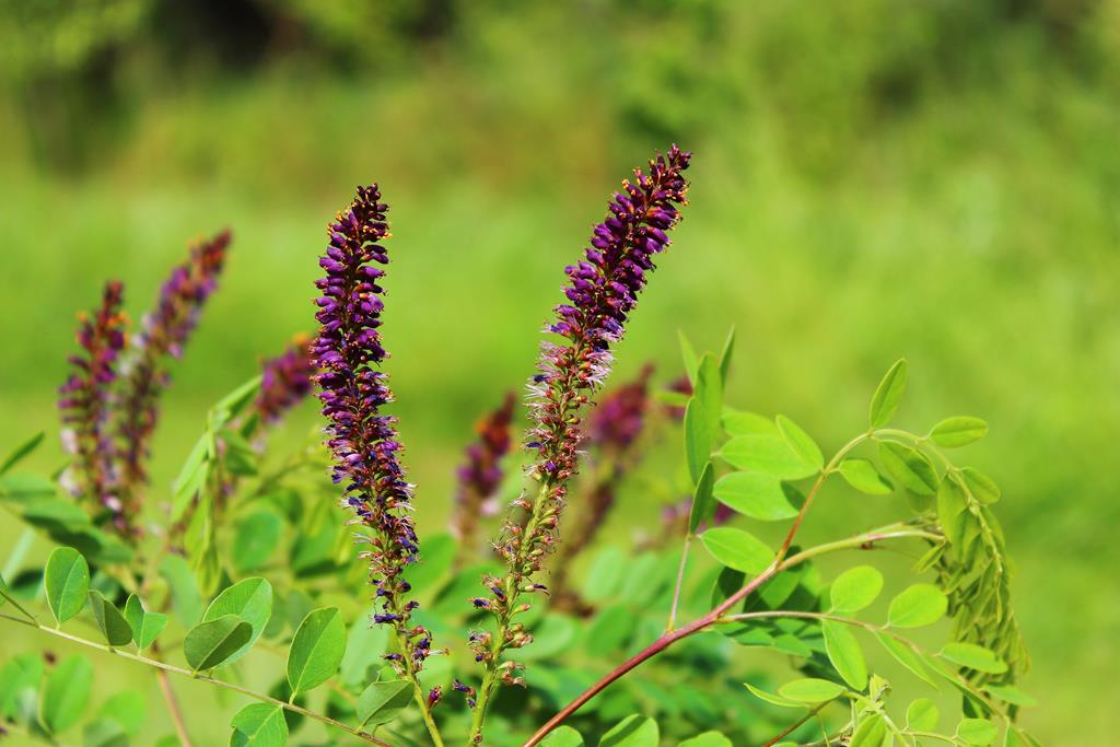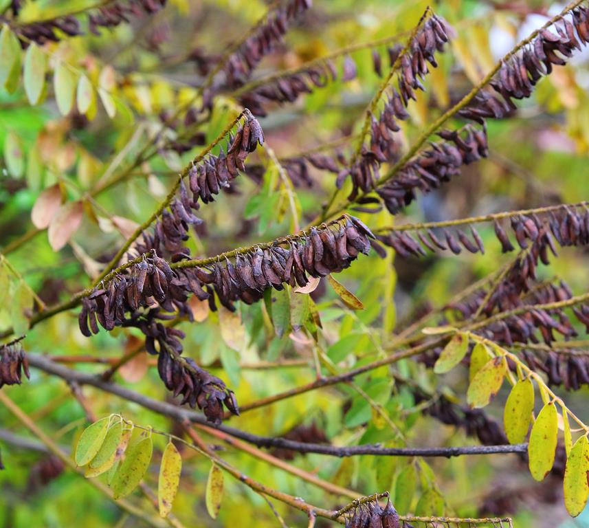 Opis. Słabo rozgałęziony, rozłożysty krzew wysokości do 5-6 m. Liście pierzaste, złożone z małych szeroko lancetowatych, zielonych listków. Kwiaty drobne, fioletowe, zabrane w kłosowate kwiatostany na szczytach pędów. Kwitnienie od pierwszej lub drugiej dekady czerwca przez około 3 tygodnie.
