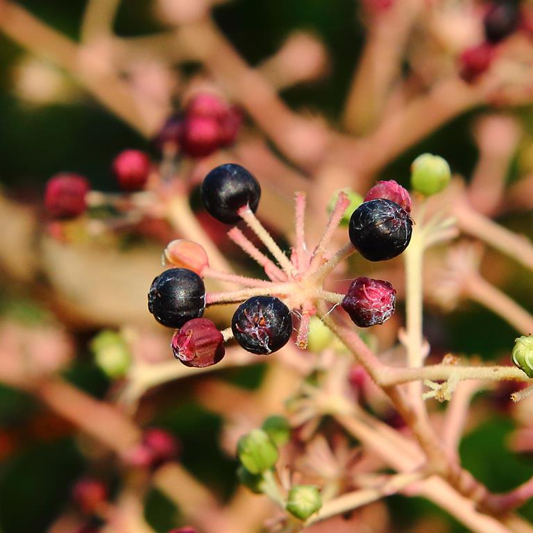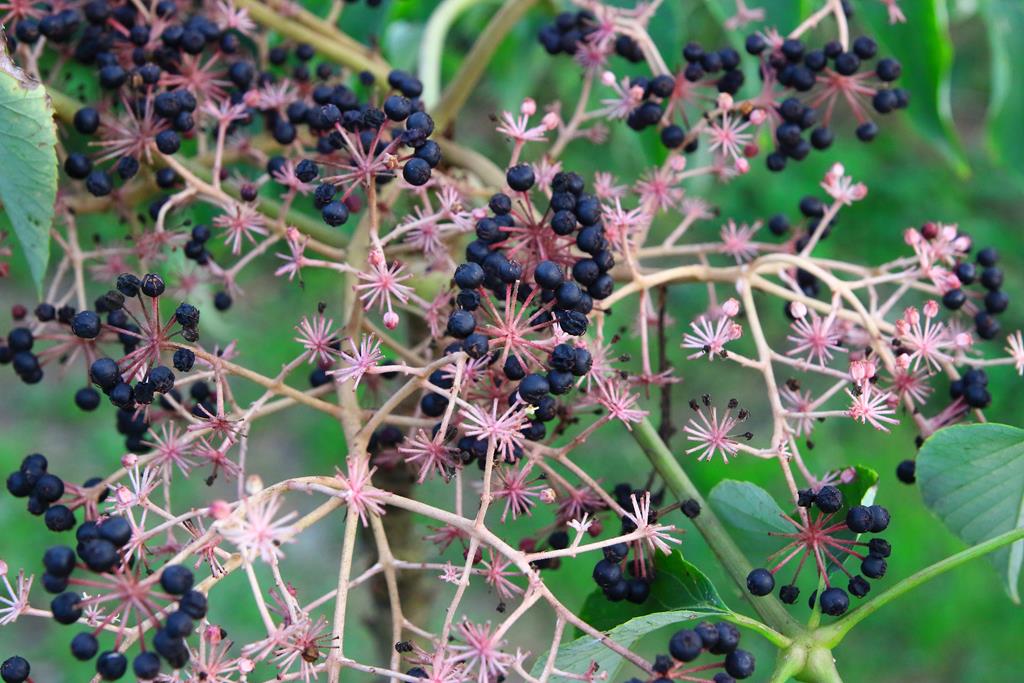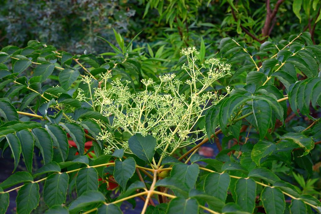 Opis. Niewielkie drzewo lub wysoki krzew o parasolowatej koronie, dorastający do 8 m wysokości. Pędy grube, wzniesione, pokryte krótkimi kolcami. Liście pierzaste, okazałe, do 100 cm dł. Kwiaty białe, niepozorne zebrane w szerokie baldachogrona. Kwitnie pod koniec lata. Owoce niewielkie, czarne. Wytwarza odrosty korzeniowe. Posiada właściwości lecznicze o działaniu podobnym do żeń-szenia.