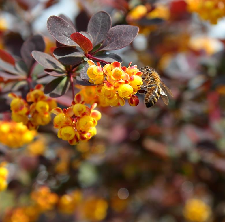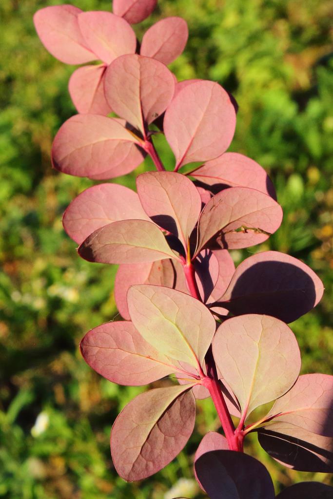 Opis. Wysoki, ciernisty krzew osiągający 2-4 m wys. Liście owalne, czerwonopurpurowe, matowe z wierzchu. Kwiaty niewielkie, żółte, zebrane w zwisające grona. Kwitnie obficie w połowie maja.