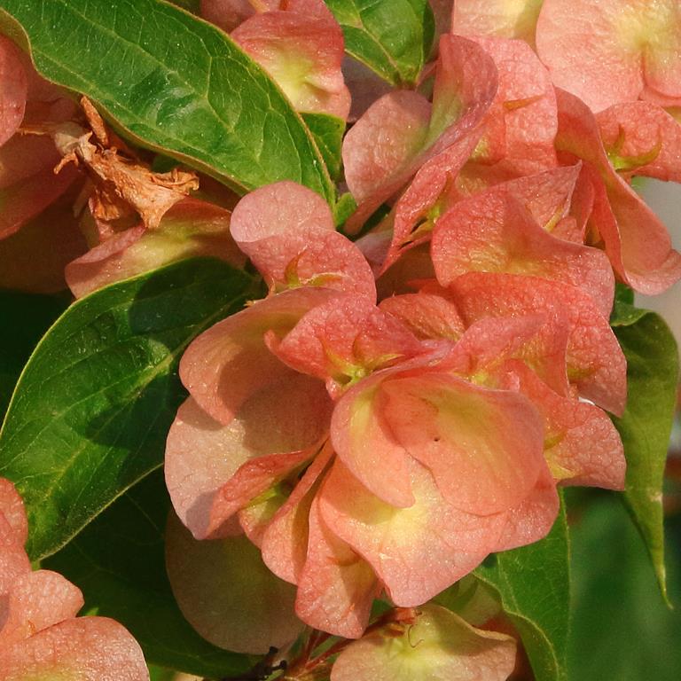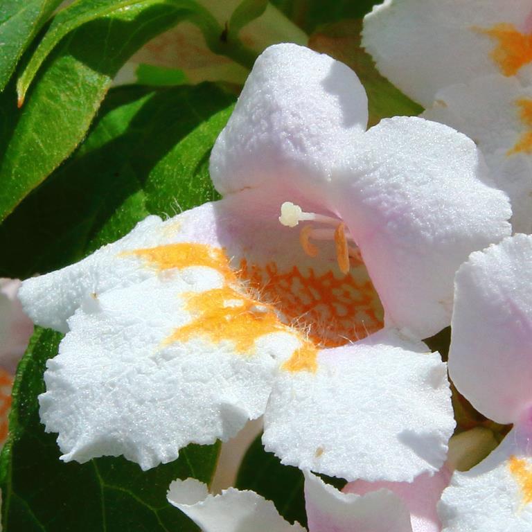 Opis. Rzadko spotykany rozłożysty krzew dorastający do 2-3 m wys. Kora jasna, łuszcząca się. Kwiaty dzwonkowate, jasnoróżowe, zebrane w wiechy. Kwitnie obficie w połowie maja. Wytwarza ozdobne tarczowate przysadki.