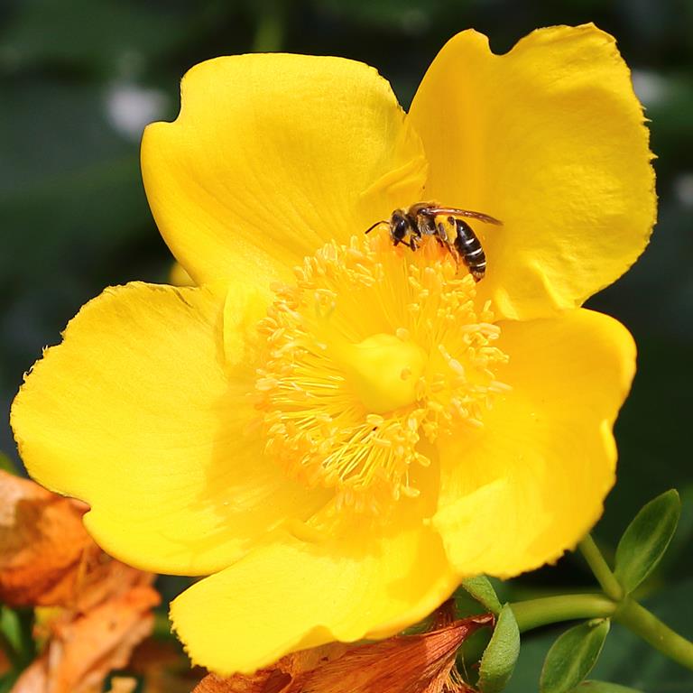 Opis. Krzew dorastający do wysokości około 1 m. Pędy czerwonawe, cienkie, liście ciemnozielone, jajowate. Kwiaty żółte, płaskie, średnicy do 7 cm. Kwitnie bardzo obficie od lipca do września.
