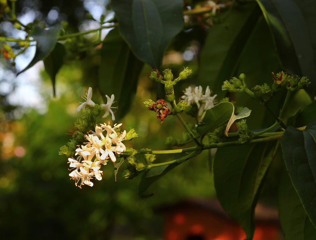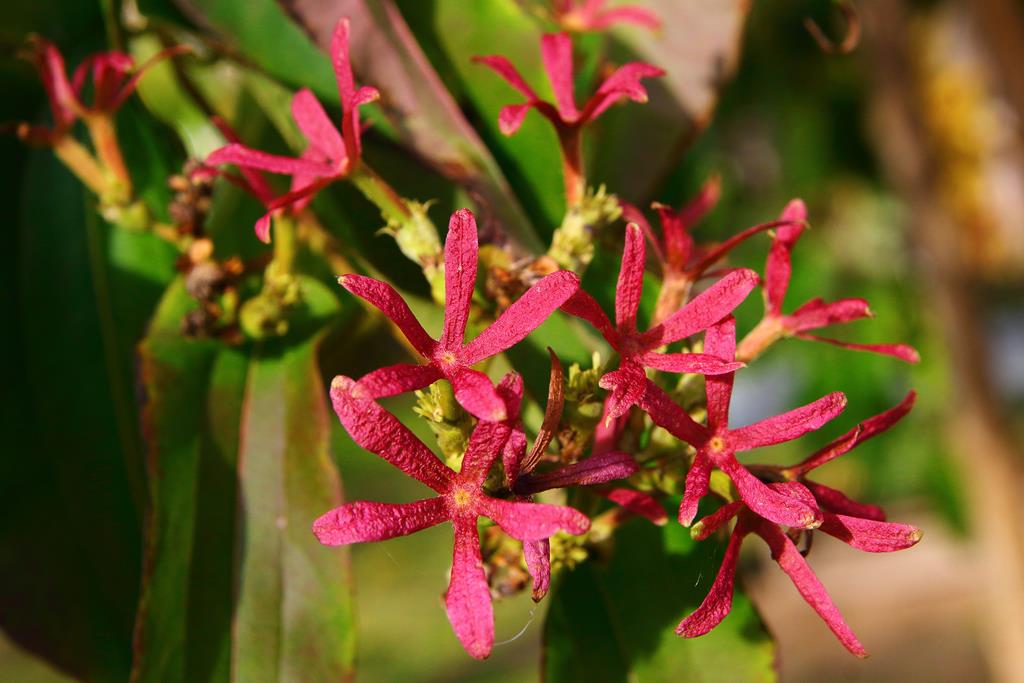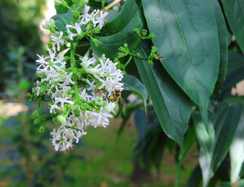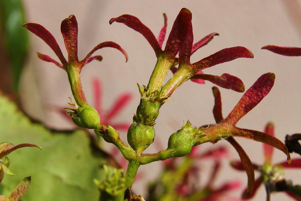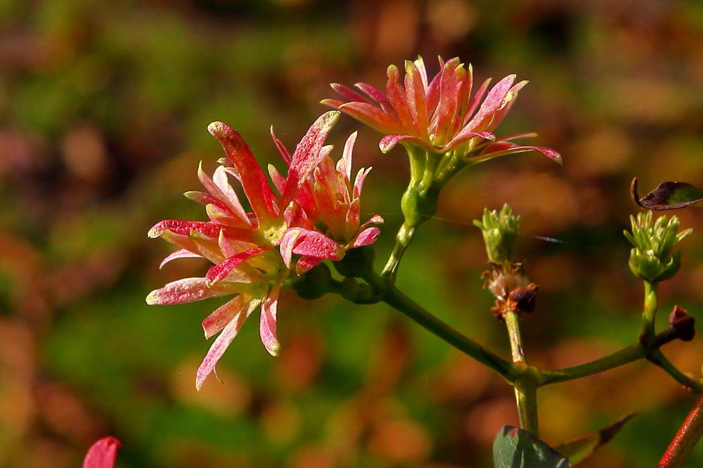 Opis. Duży, zazwyczaj kilkupniowy krzew dorastający do 4-6 m wysokości. Pokrój rozłożysty, luźny, pędy wyprostowane, słabo rozgałęzione. Kora na grubych pędach szarawa, silnie łuszcząca się. Kwiaty białe, zebrane w wiechy, ukazujące się w sierpniu i wrześniu. Owoce okryte czerwonymi, wydłużonymi działkami kielicha.