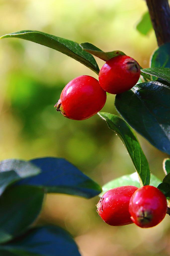 Opis. Gęsty, silnie rozrośnięty krzew do 2 m wysokości. Liście eliptyczne, ciemnozielone, błyszczące, jesienią przebarwiające się na szkarłatnoczerwony kolor. Kwiaty białe, drobne, czerwonawo zabarwione u nasady. Kwitnie na przełomie maja i czerwca. Owoce czerwone, wydłużone, do 1 cm długości.