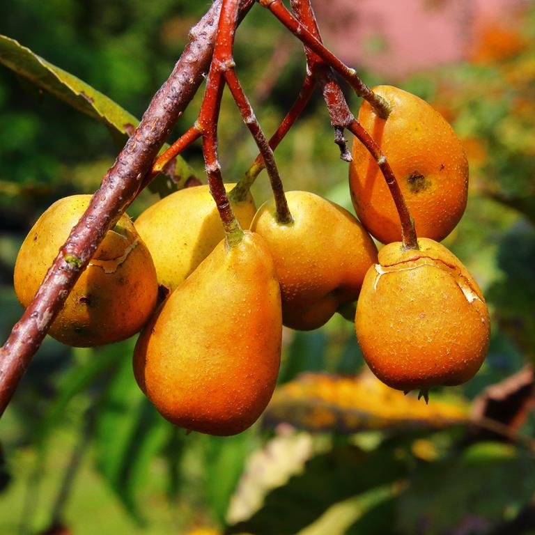 Opis. Drzewo wysokości do 10 m. Pokrojem przypomina gruszę. W okres owocowania wchodzi po 8-10 latach uprawy. Kwitnie w połowie maja. Owoce drobne, gruszkowate, żółte z czerwonym rumieńcem.