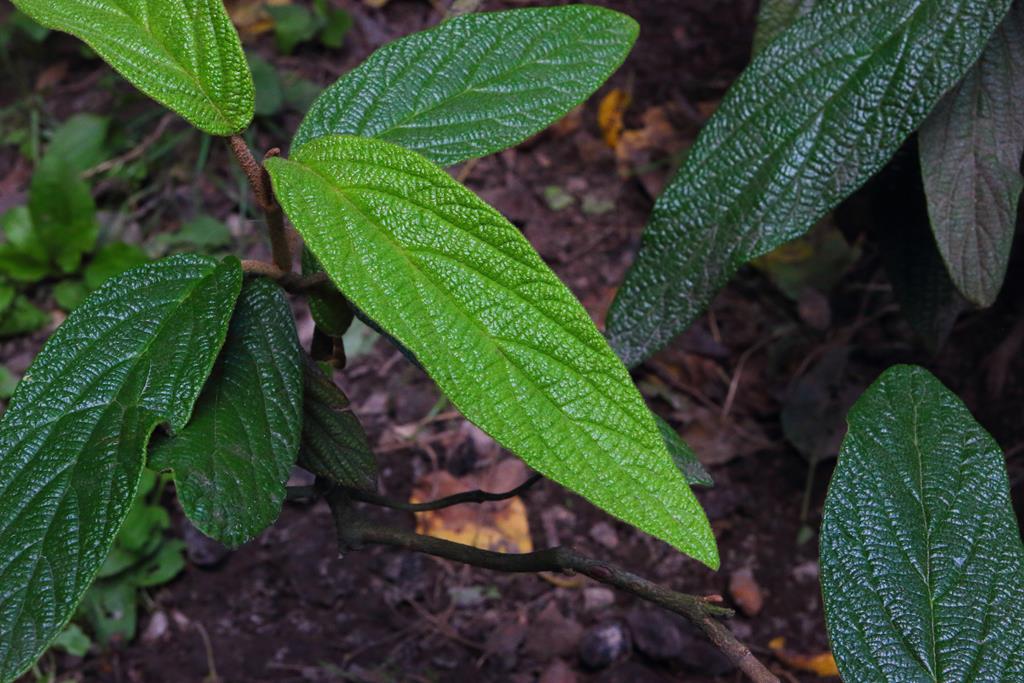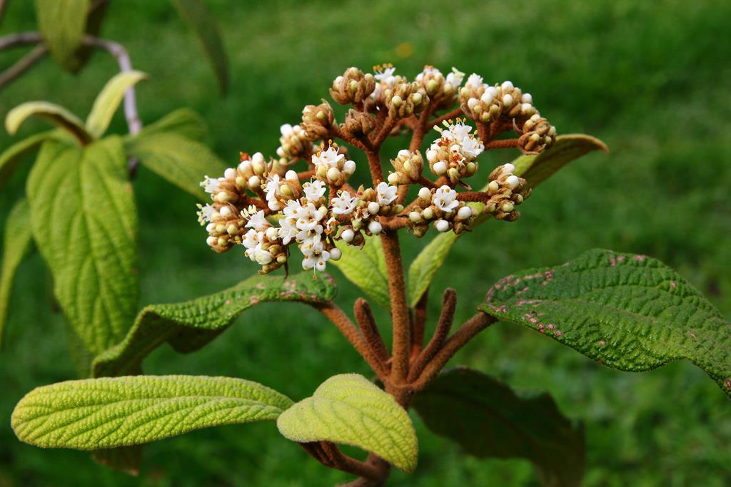 Opis. Zimozielony krzew dorastający do wysokości około 3 m. Pokrój luźny, pędy sztywne. Liście duże, skórzaste, z szarym kutnerem na spodzie. Kwiaty drobne, kremowobiałe, zebrane w płaskie baldachogrona o średnicy od 20 cm, ukazujące się w maju. Owoce purpurowe, później czarne, dojrzewają we wrześniu.